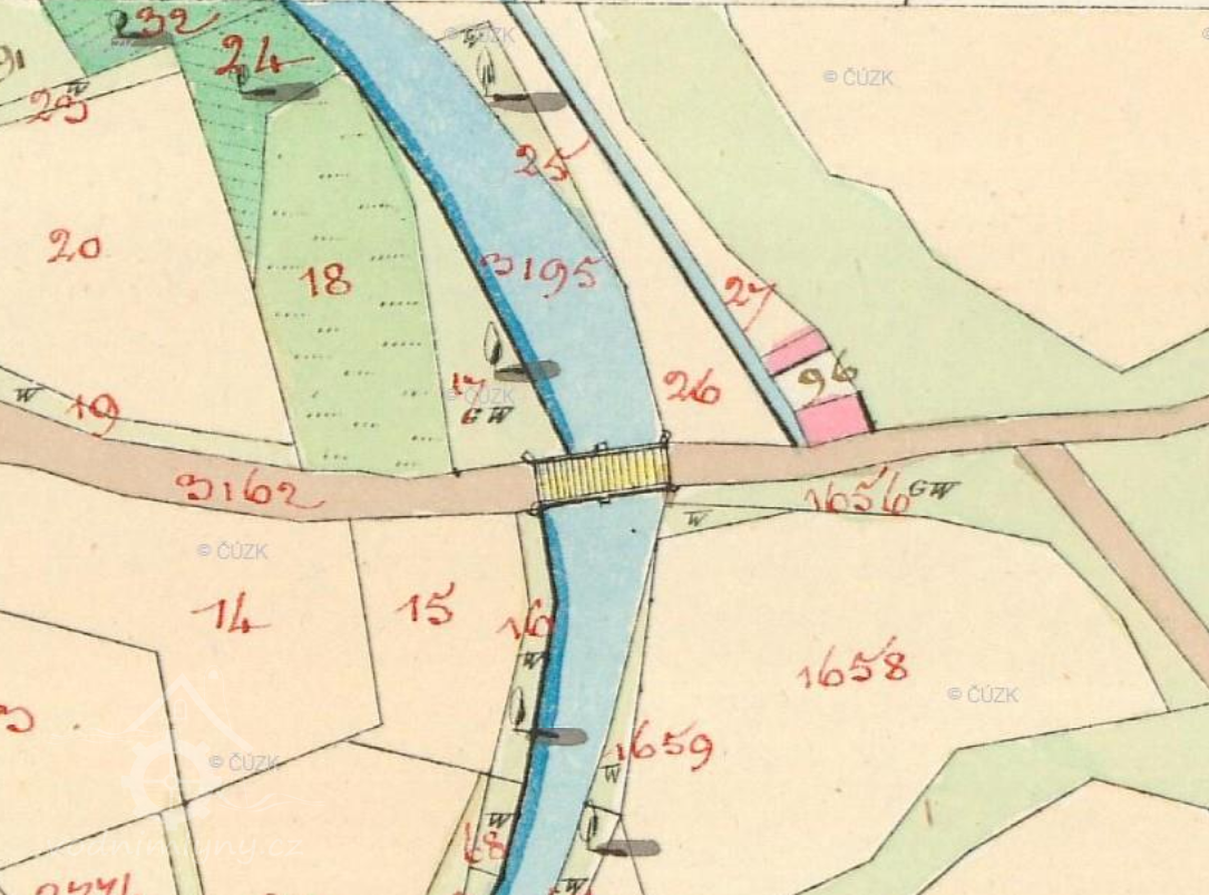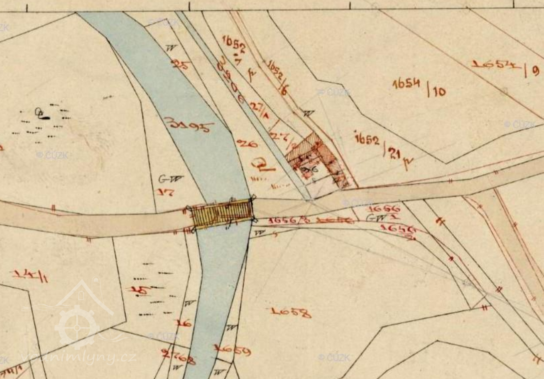 110 m nad mlýnem býval malý jez, který odváděl vodu strouhou do vantrok 4 m dlouhých a 1,3 m širokých se žlaby na obě kola a jedním stavidlem jalového přepadu.