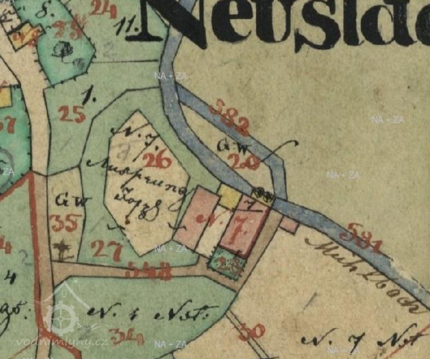 Mlýn nebyl pravděpodobně jediným vodním provozem v malé obci, jelikož při odtokovém mlýnském kanálu přibyl ve druhé polovině 19. století objekt (pila?) na st.p. 42 s vlastním náhonem beroucím vodu právě z odtoku od mlýna.Neustadtlmühle stál osamoceně a nejjižněji z novoměstečské zástavby v nadmořské výšce 517 metrů, zhruba 50 metrů od levého břehu Otavy. Nejstarší mnou nalezený zápis o mlynáři v Novém Městečku je z roku 1715, kdy zde mlynařil Jakob Geiger. Mlýn měl původně přiděleno číslo popisné 43, které bylo někdy v první čtvrtině 19. století změněno na čp. 7. Areál mlýna měl charakter uzavřeného dvora, jelikož dvě obdélníkové, při sobě rovnoběžně stojící budovy byly propojeny v zadních traktech další menší stavbou a vpředu pak spojené bránou. Dvě vodní kola (zakreslená v mapě stab.kat. 1837), která poháněl přibližně 70 metrů dlouhý náhon, byla umístěna při zadním štítu pravé, vyšší budovy (z pohledu od brány). Odtokový kanál po dalších 600 metrech ústil do řeky. Pro zabezpečení dostatečného množství vody v náhonu byla do koryta řeky vestavěna hráz. V roce 1957 mlýnské budovy ještě stály. Roku 1964 již ne. Zbourány byly nejspíše v roce 1959.