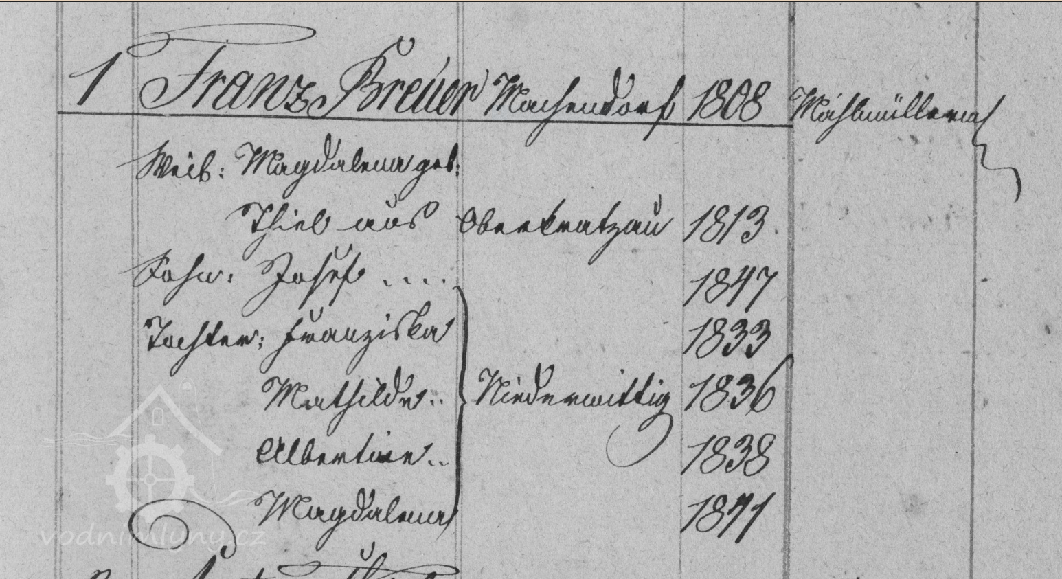 Od začátku 30. let 19. století zde byl jiný mlynářský rod, a to Franz Breuer, který pocházel ze mlýna v Machníně čp. 6, kde se narodil jako syn tamního mlynáře Josefa Breuera. Za manželku měl Magdalenu Thiel, která také pocházela z mlynářského rodu. Jejím otcem byl mlynář Anton Thiel, že mlýna v Horní Chrastavě čp. 46. Matriky zaznamenaly narození jejich dcer Franzisky (1833), Mathildy (1836), Albertiny (1838), Magdalena (1841) a syna Josefa Juliuse (1847).