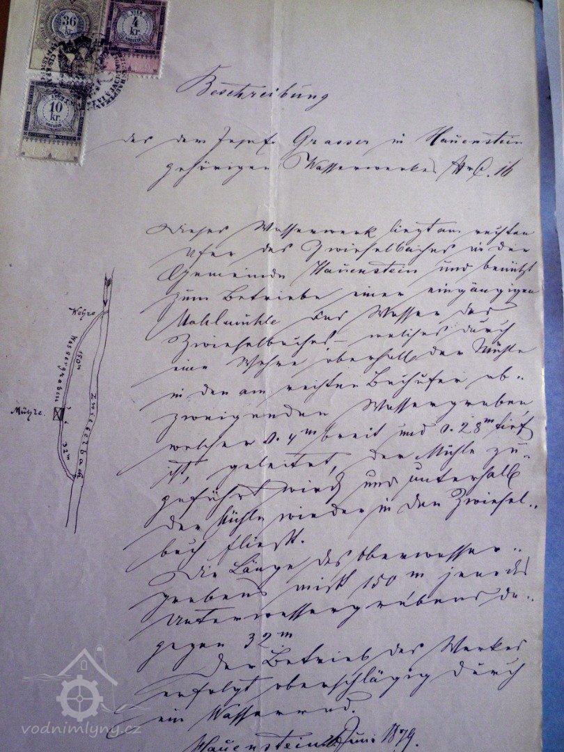 Červen 1879: Vodní mlýn s jedním složením leží na pravém břehu potoka Zwieselbach v obci Hauenstein a k provozu využívá vodu z potoka Zwieselbach, která je pomocí jezu nad mlýnem svedena do náhonu odbočujícího z pravého břehu potoka, náhon je široký 0,4 m a hluboký 0,28 m je přiváděna do mlýna a pod mlýnem opět teče do potoka Zwieselbach. Délka horního náhonu je 150 m, délka dolního odtoku 32 m.