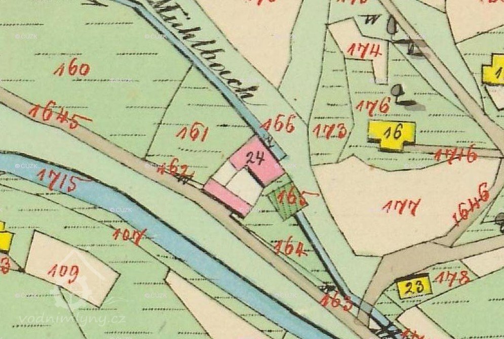 PopisV r. 1930 zde bylo 1 kolo na svrchní vodu, průtok 0,13 m3/s, spád 3,3 m, výkon 3,72 k.