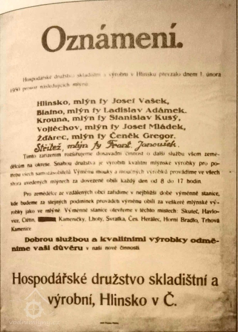 1.2.1950 převzalo Hospodářské družstvo skladištní a výrobní v Hlinsku