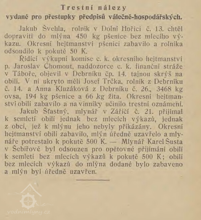 V roce 1918 byl mlýn uzavřen pro přijímání obilí ku mletí bez mlecích výkazů. Mlynář Jakub Šťastný.