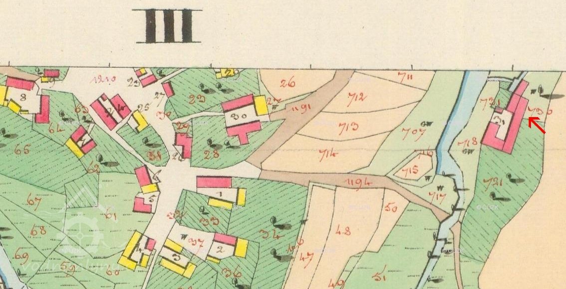Mlýn, který byl až třetí v obci je matrikami doložen v r.1732.