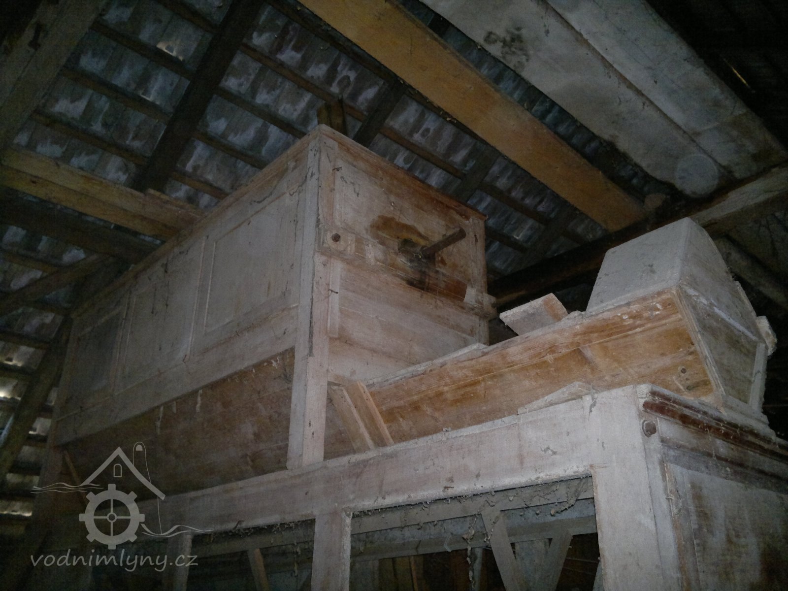 Transmise, paleční kolo, převody, kapsové výtahy, čistící zařízení, mlecí kameny, moučnice, vodní kolo s hřídelí.