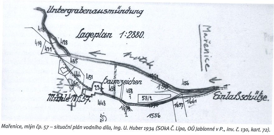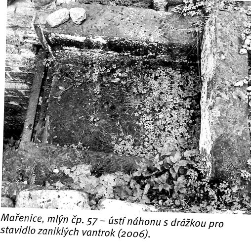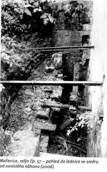 Náhon z potoka odbočoval u kamenného jezu 300 m jižně od křižovatky silnice Mařenice - Krompach - Světlá. Vpouštěcí stavidlo mělo světlou šířku 0,87 m a výšku 1,14 m. Dnes již nefunkční náhon se stěnami z nasucho kladených pískovcových kvádrů měl profil 1,5 x 1,6 m, těsně před mlýnem byl jalový přepad se stavidlem o světlé šířce 0,77 m a výšce 1 m. Před mlýnem náhon podchází mostek komunikace s propustkem z lomového zdiva s překlady z kamenných desek. Na konci náhonu při východním průčelí mlýna byly pískovcové (dobetonované) vantroky s dráží pro kovový rám stavidla. Voda vtékala do hluboké zděné lednice, na jejímž dně byl otvor pro odtok vody do klenutého odtokového kanálu. Ten měl šířku 0,75 m a hloubku 1,15 m. (MH)