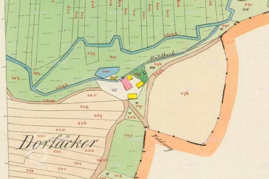 u mlýna 13 ha zem. půdy, 1 pár těžkých koní, 15 ks hov. dob., 5 vepřů, uskladněno 7 q pšenice, 30 q žita a 30 q ovsa