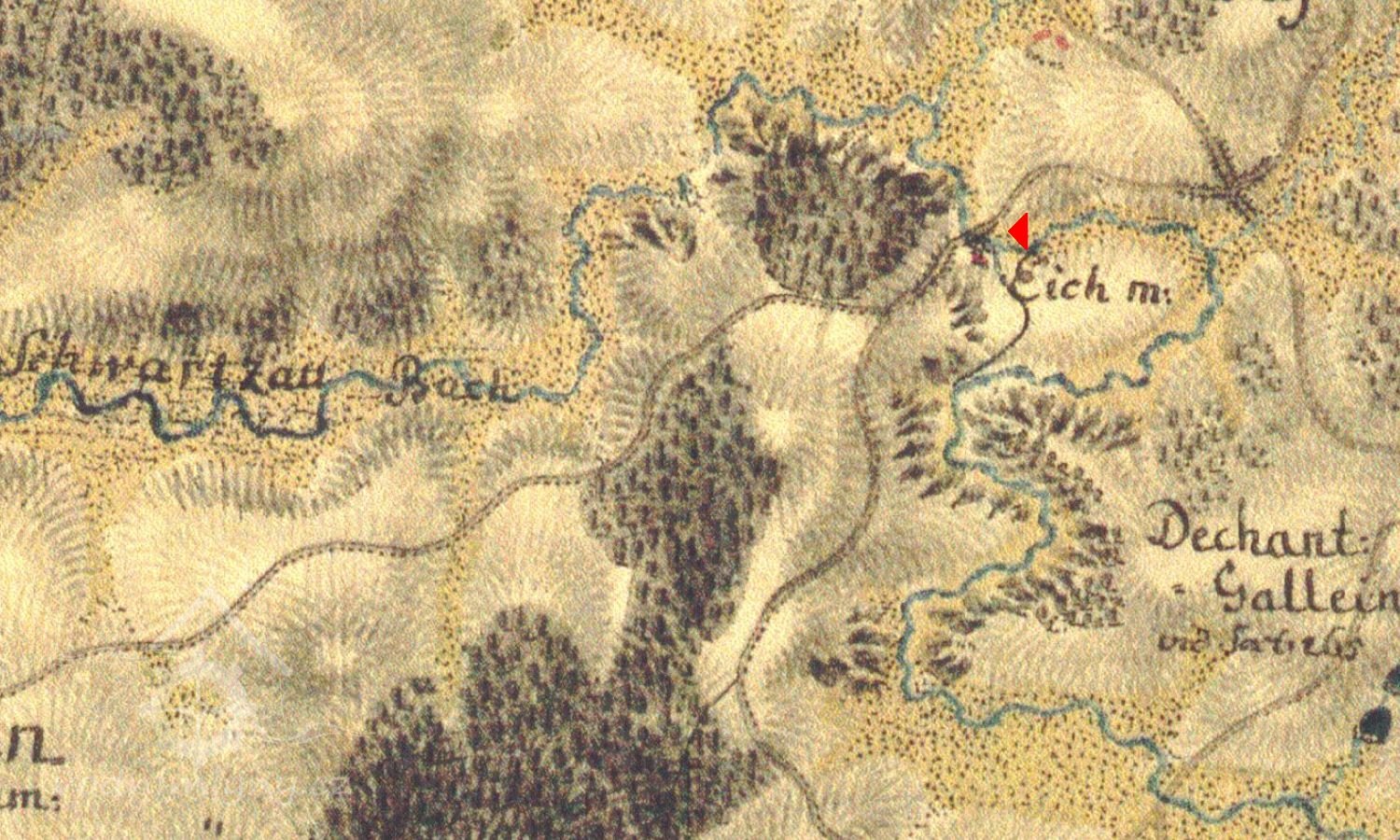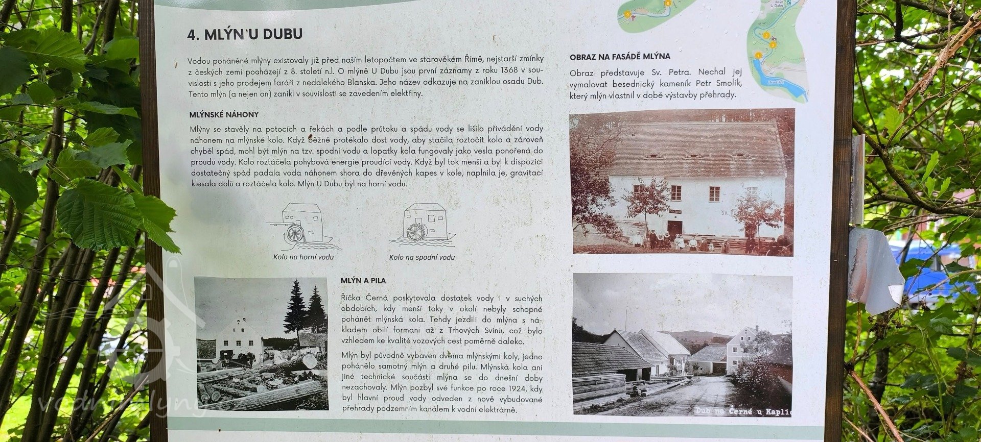 Mlýn na říčce Černé dříve Eich muehle, nebo Aich muehle je poprvé připomínán už roku 1368, kdy ho Jan z Dobré Vody prodal faráři  z Blanska. Nárok na mlýn si v roce 1591 prosadil Vilém z Rožmberka. Provoz mlýna se zastavil v roce 1924, kdy byla většina vody odvedena do nedaleké elektrárny. Poslední majitel Petr Smolík nechal na hlavní budově vytvořit malbu zobrazující svatého Petra.