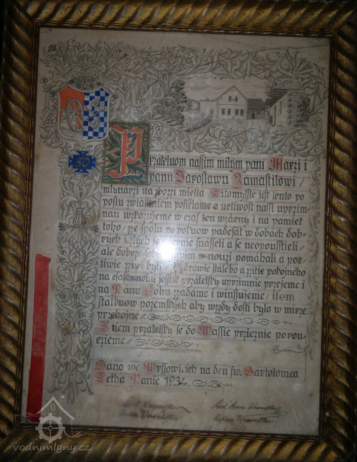 Přátelům našim milým, paní Marii i panu Jaroslavu Zamastilovi, mlynáři zboží, města Litomyšle, list tento po poslu zvláštním posíláme a uctivost naší upřímnou vzkazujeme v čas ten vzácný i na paměť toho že spolu po roků padesát v dobách dobrých i zlých se věrně snášeli a se neopustili, ale dobře sobě i jiným v nouzi pomáhali a poctivě živi byli. Zdraví stálého i žití pokojného čas mnohý ještě přátelsky upřímně přejeme i na pánu Bohu žádáme i vinšujeme, i těm statkům pozemským, aby vždy dosti bylo v míře přehojné. S tím přátelsky se do Vaší přízně poroučíme. Dáno ve Vršovicích na den Sv. Bartoloměje léta Páně 1934
