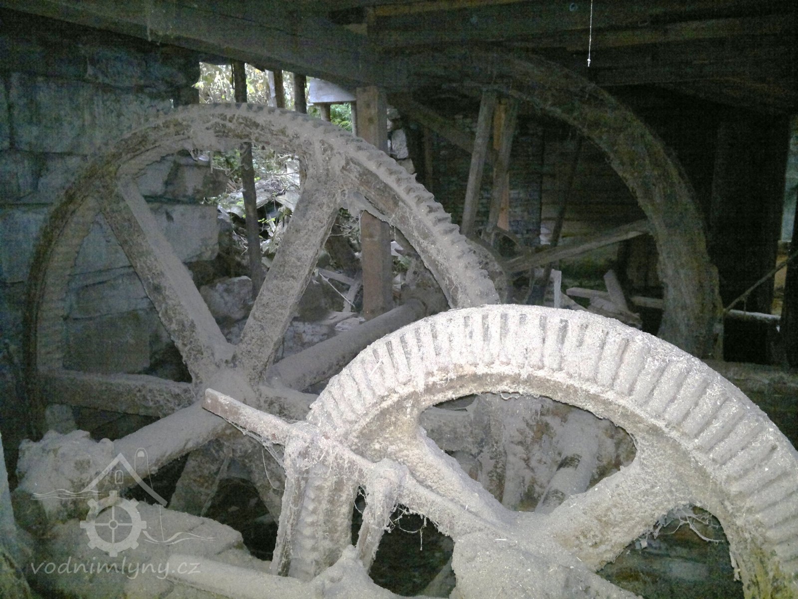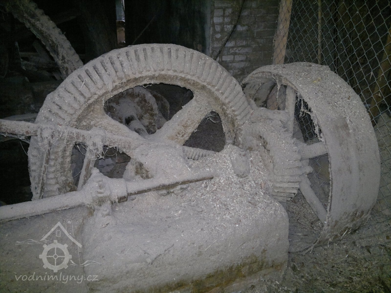 celkový pohled na paleční převody pily od vodního kola, 2013, © David Veverka, (Prvky na obrázku: transmise, řemenice, převody)