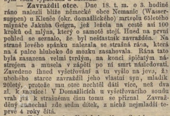 18. 2. 1874 byl mlynář Jakub Geiger zavražděn vlastním synem. (RR).
