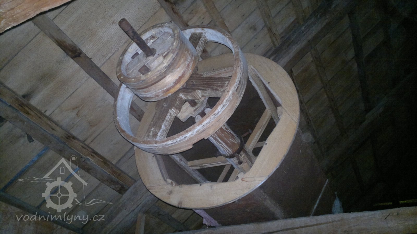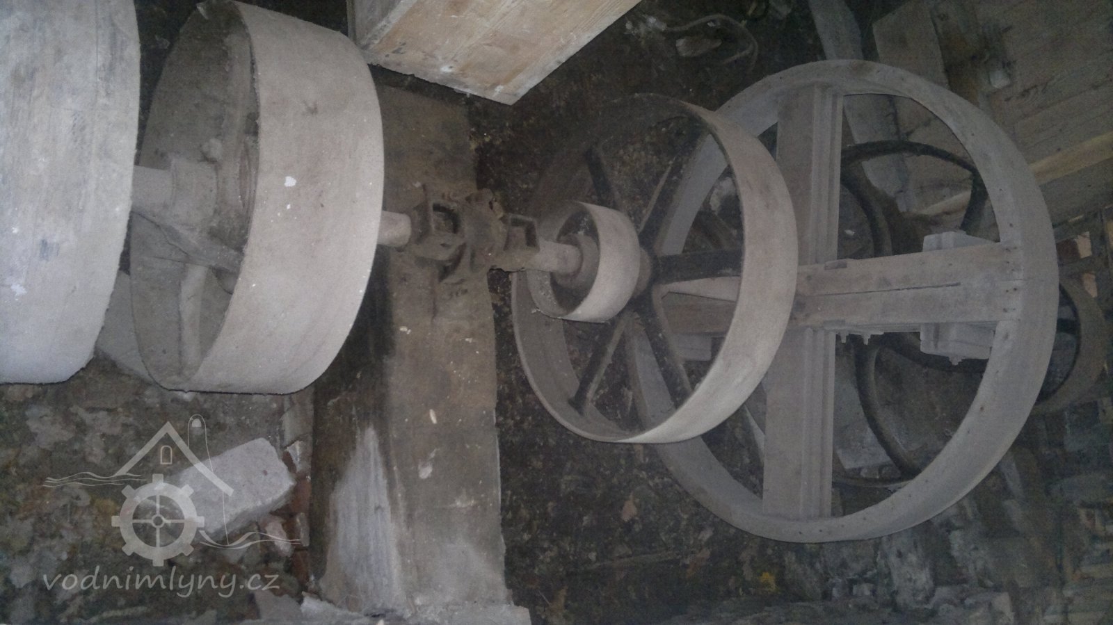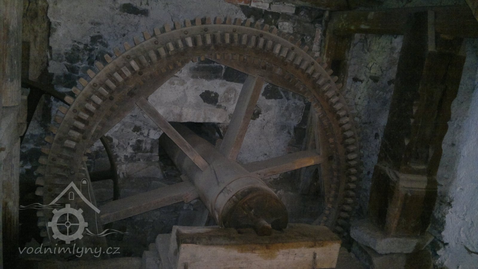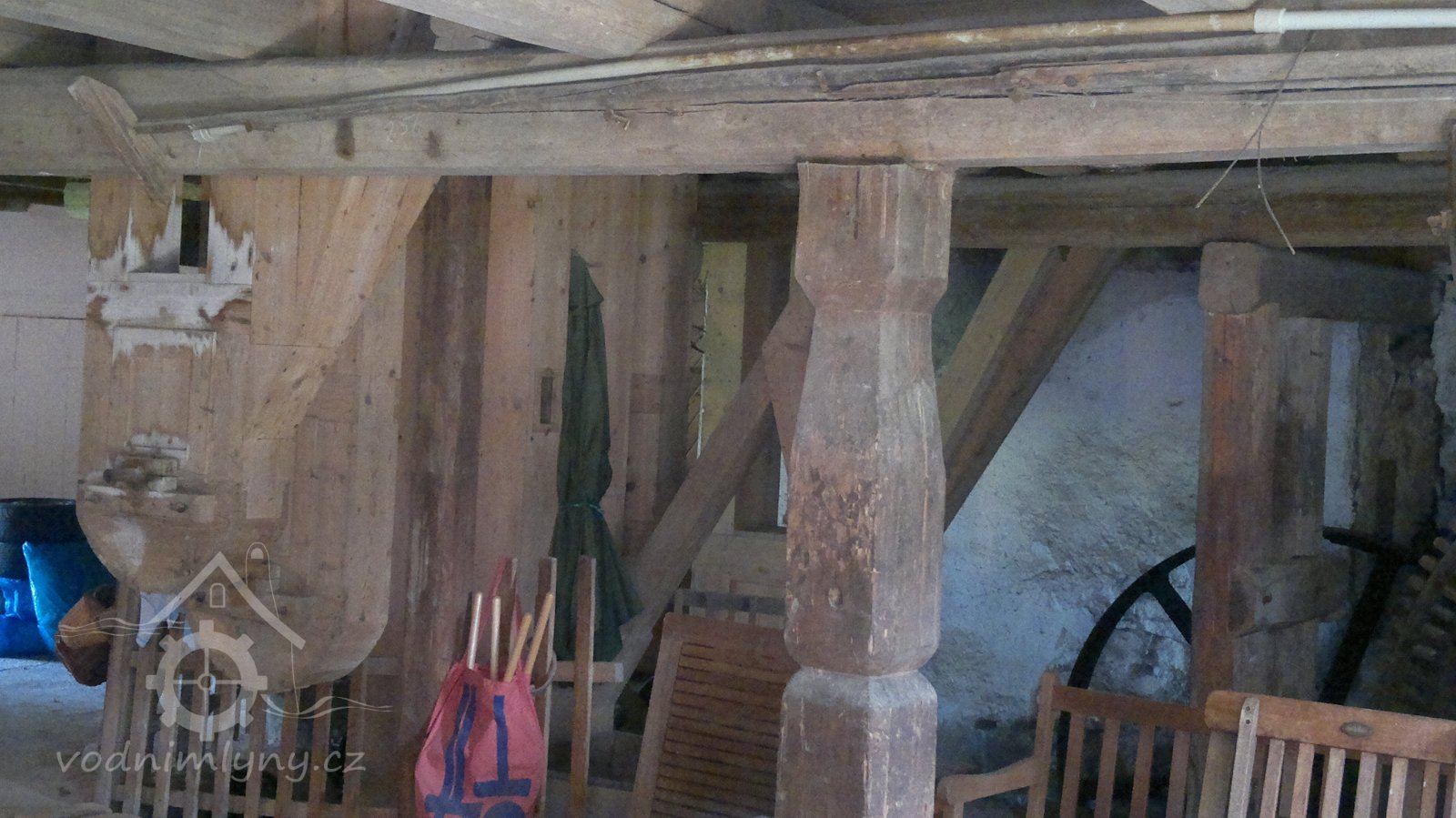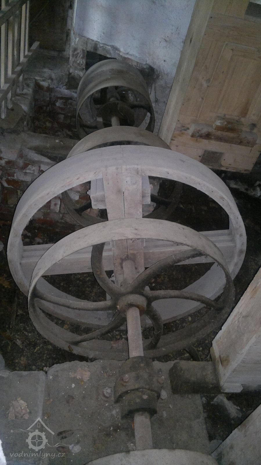 Celodřevěné vodní kolo na vrchní vodu. Zajímavostí bylo jeho umístění v lednici ve spodních prostorách uvnitř mlýnské budovy.