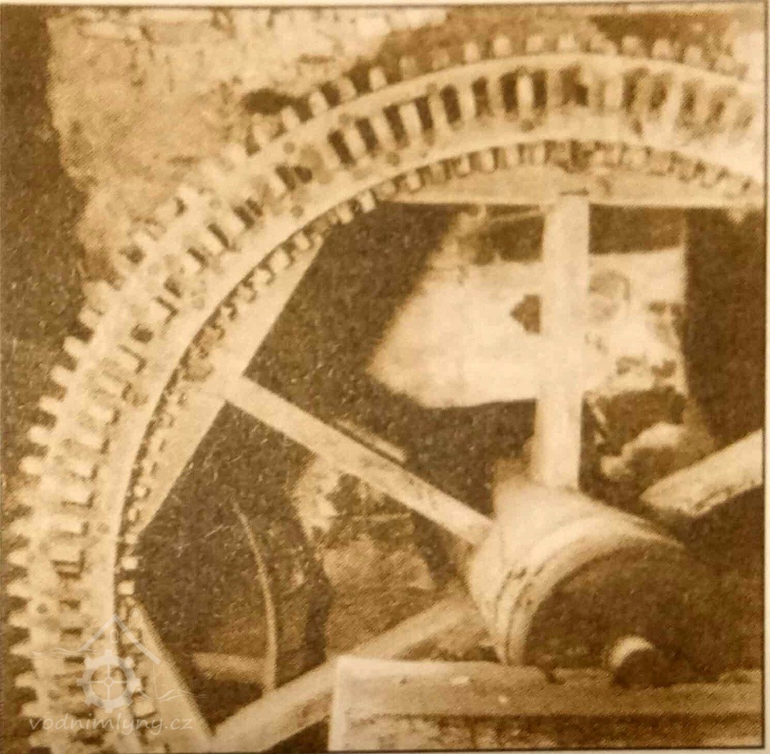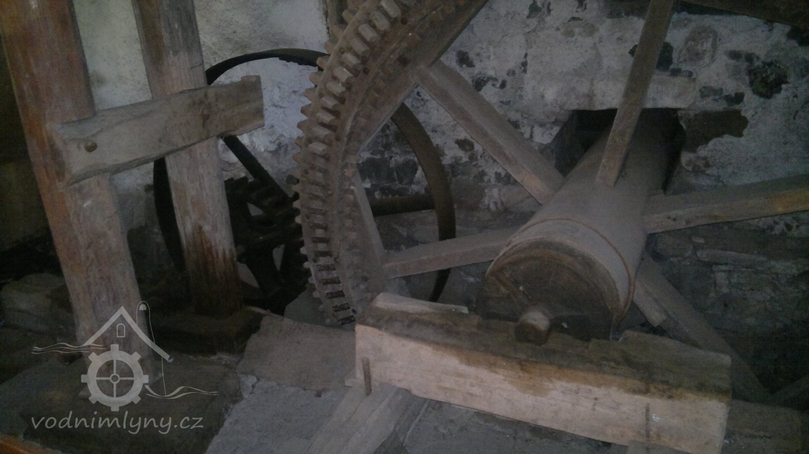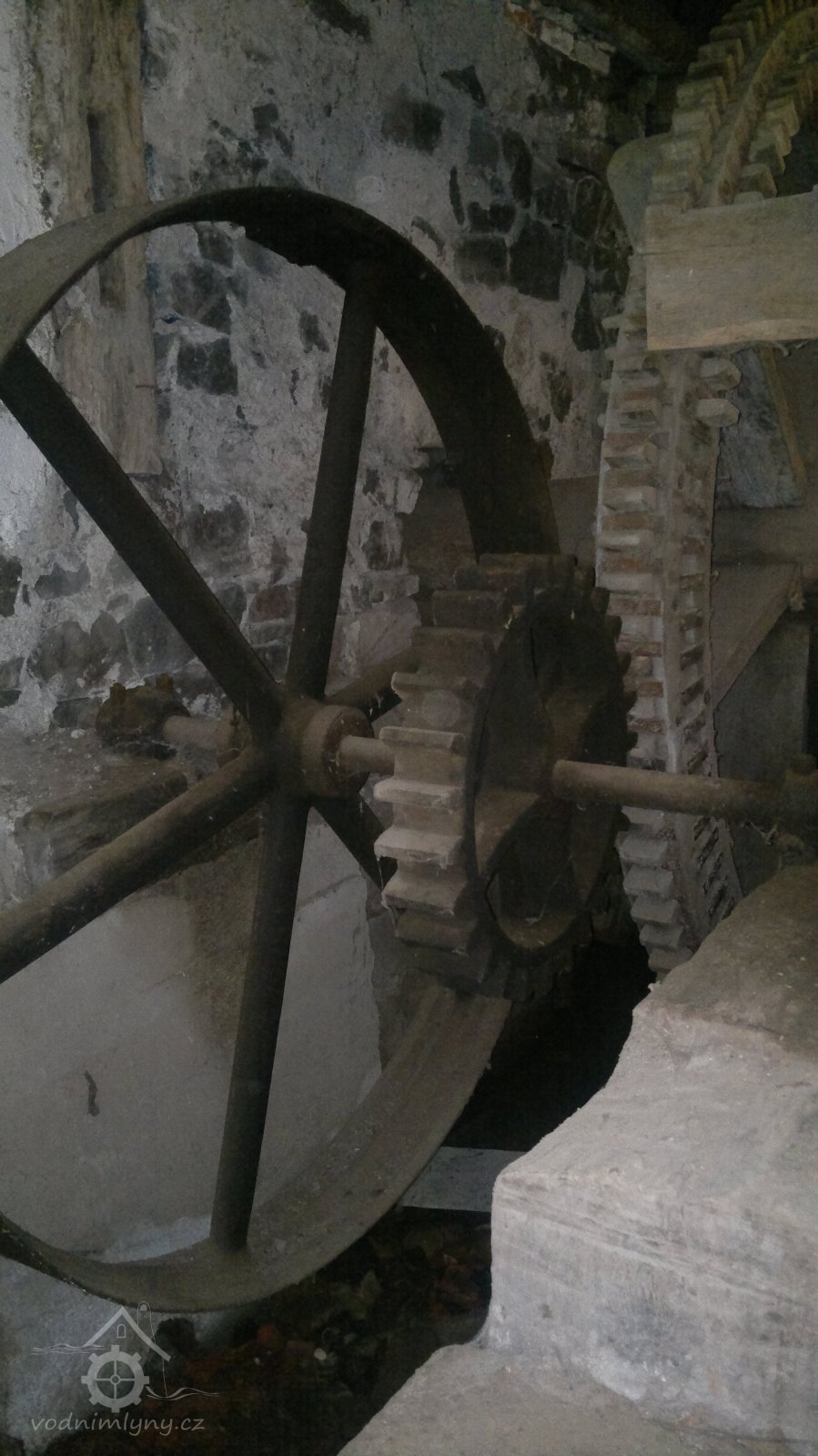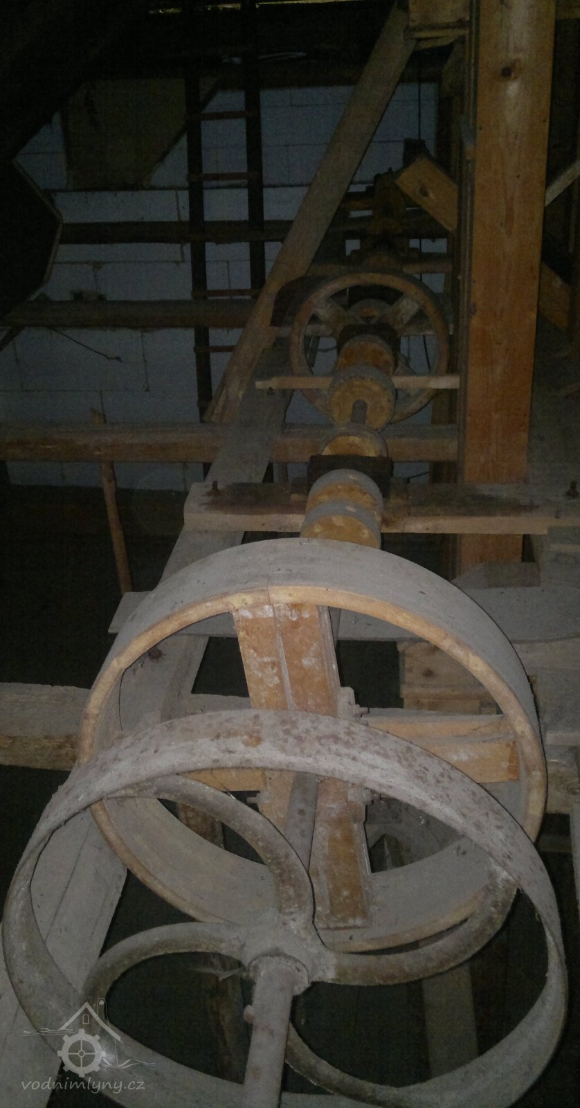 Celodřevěné vodní kolo na vrchní vodu. Zajímavostí bylo jeho umístění v lednici ve spodních prostorách uvnitř mlýnské budovy.