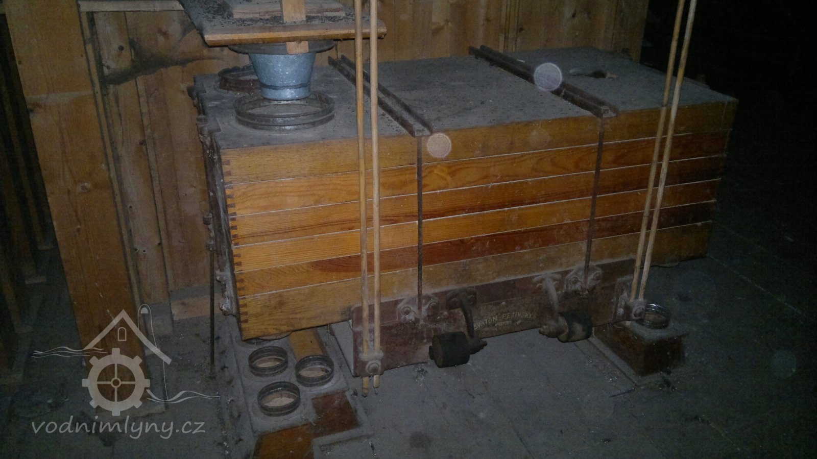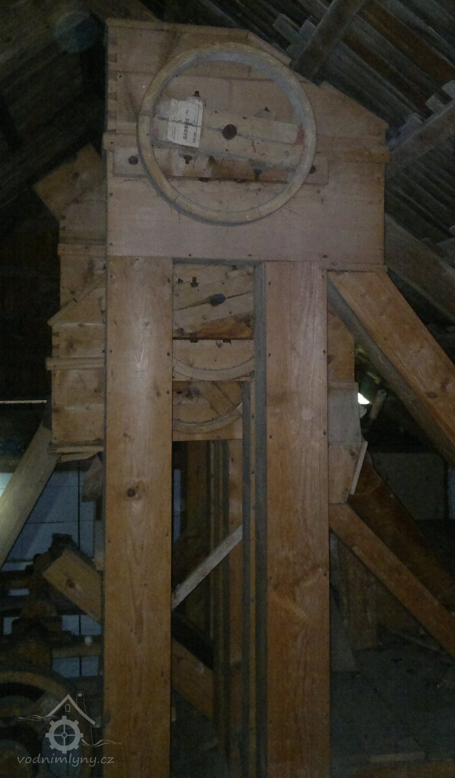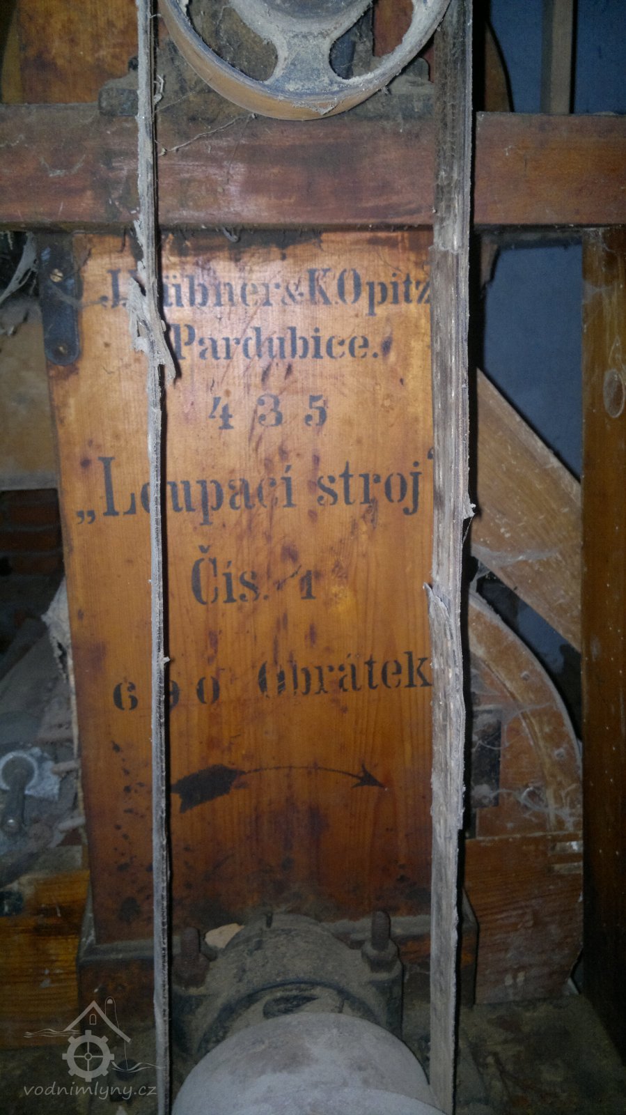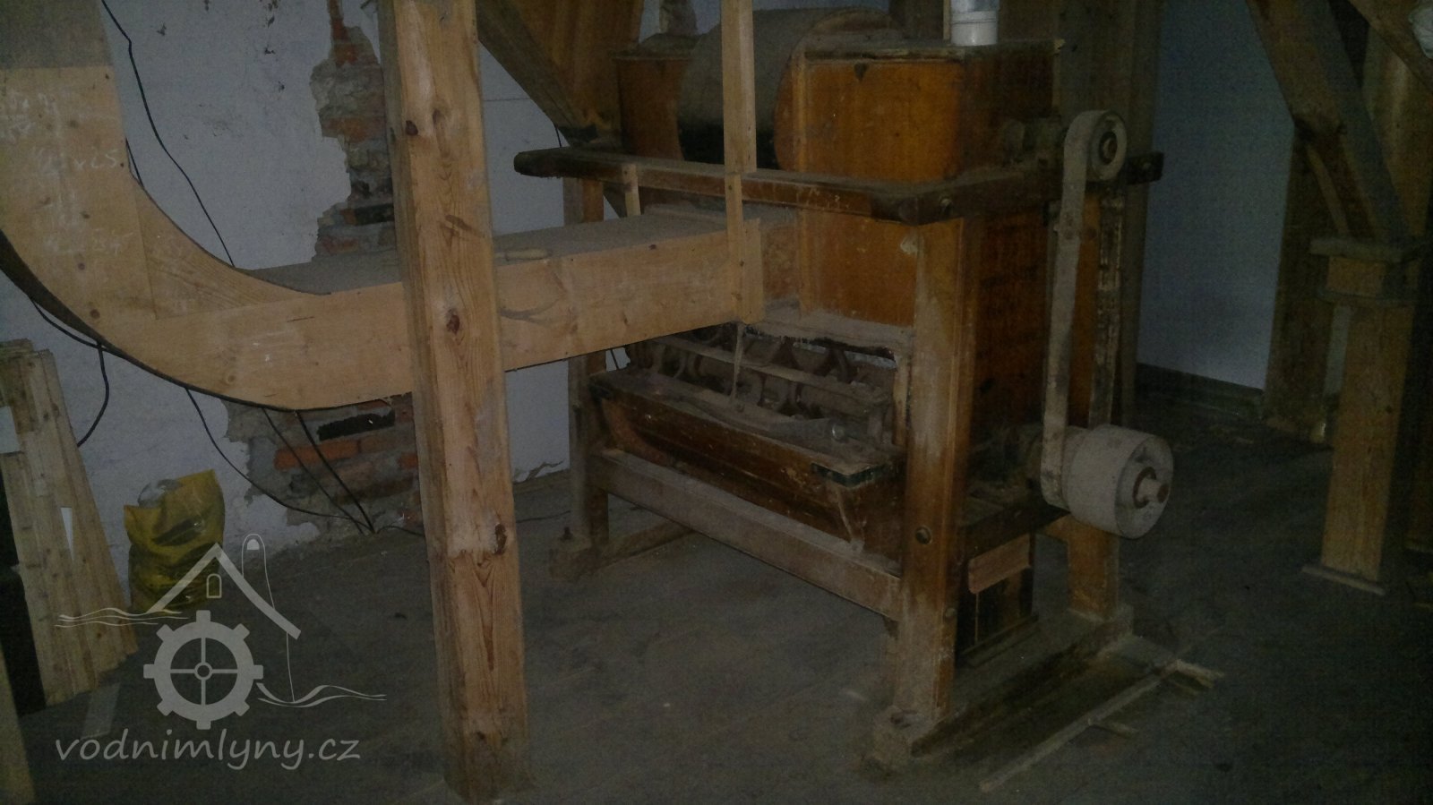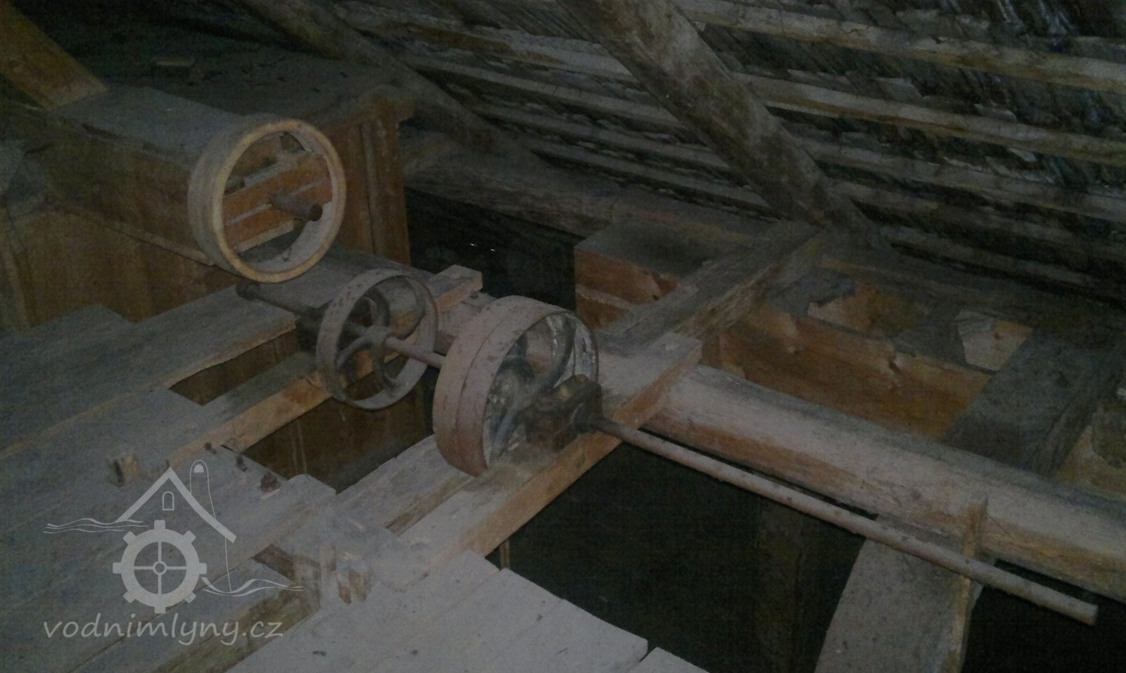 Celodřevěné vodní kolo na vrchní vodu. Zajímavostí bylo jeho umístění v lednici ve spodních prostorách uvnitř mlýnské budovy.