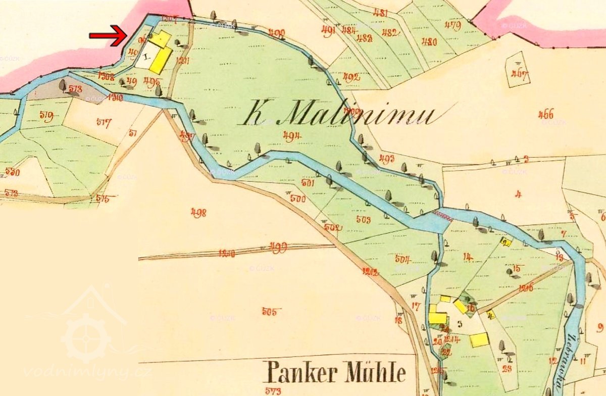 V roce 1930 1 kolo na vrchní vodu o průměru 350 cm; průtok 0,113 m3; spád 2,60 m; výkon 3,6 HP.