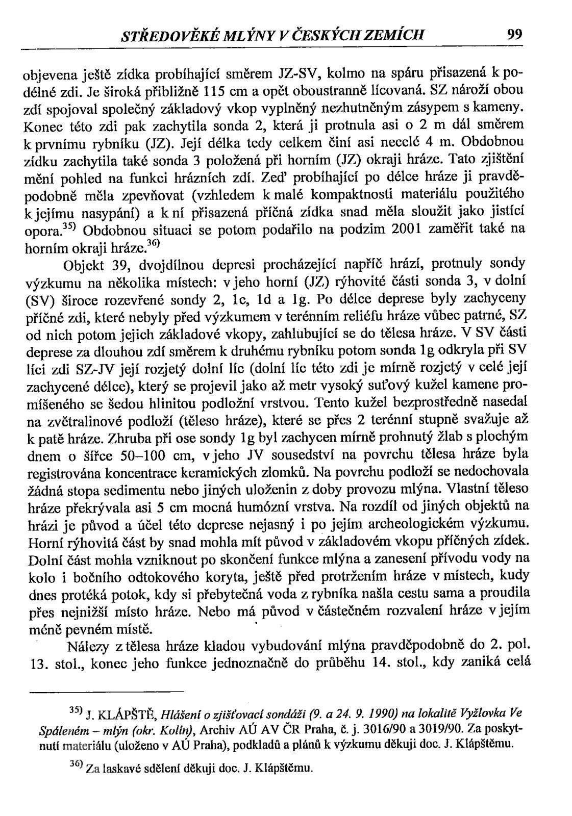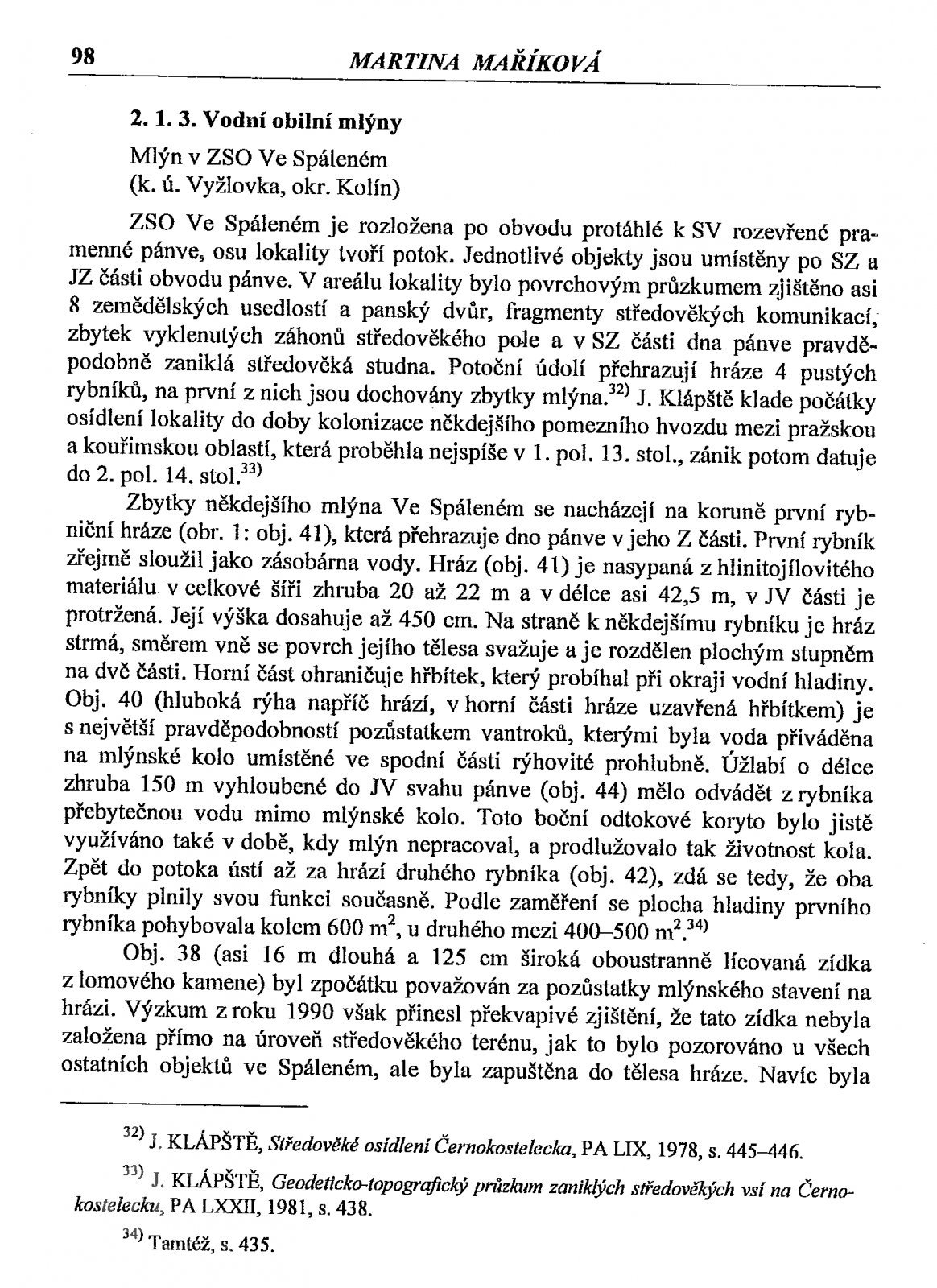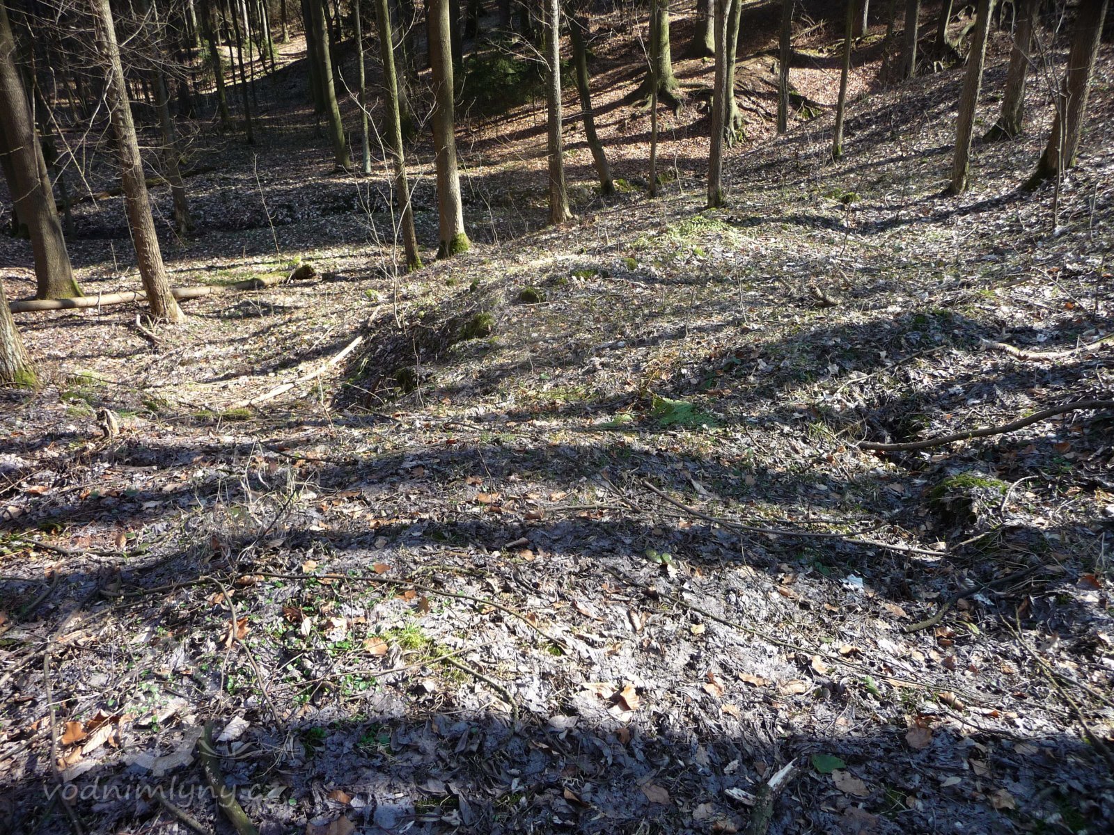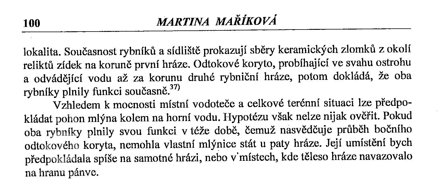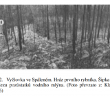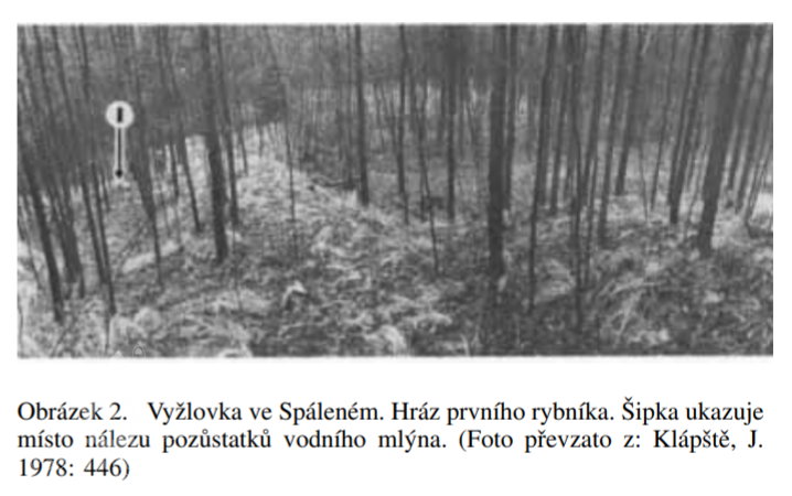 Zajímavý archeologický nález byl učiněn v zaniklé středověké vsi Ve spáleném, na katastrálním území obce Vyžlovka, jejíž počátky jsou kladeny do 13. století, přičemž zánik lokality je předpokládán na počátku 2. poloviny 14. století (Klápště 1978: 445–446). Nedaleko této zaniklé vsi, na samotě, byly na koruně hlinitojílovité hráze jednoho ze dvou menších rybníků s největší pravděpodobností objeveny relikty již zaniklého vodního mlýna (obr. 2). V reliéfu terénu zůstaly zachovány pozůstatky přívodu vody ke kolu na vrcholu hráze a boční koryto pro odvod přebytečné vody mimo mlýn. Archeologické výzkumy v letech 1999 až 2001 odkryly oboustranně lícované zídky z lomového kamene, které byly součástí tělesa hráze. Dle keramického materiálu získaného během povrchových sběrů a exkavace lze datovat založení mlýna do průběhu 2. poloviny 13. století, přičemž konec jeho funkce lze položit do průběhu 14. století, kdy zaniká celá ves. Na základě celkové situace na lokalitě a nízkého průtoku místní vodoteče je pravděpodobné, že se jednalo o mlýn na horní vodu. Tuto skutečnost však nelze jednoznačně prokázat (Klápště 1981: 435: 438; Maříková 2005: 98–100). Závěry však nekorespondují s výpovědí Luďka Štěpána o zavádění mlýnů s koly na horní vodu v polovině 14. století (Štěpán 2000: 55; Štěpán 2002: 12; Štěpán et al. 2008: 151).