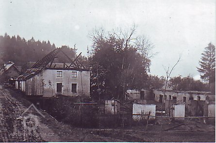 Pod hrází rybníku je mlýn, jednopatrová budova, která s budovami hospodářskými, stodolou, chlévy a kolnou uzavírá nepravidelný čtverhran, do něhož vedou dvoje vrata; jedna od silnice, druhá od dolejších chalup. Ke stavením přiléhají dvě zahrádky vroubené živým plotem smrkovým, vysázené ovocnými stromy. První je pod hrází, druhá doleji u potoka.