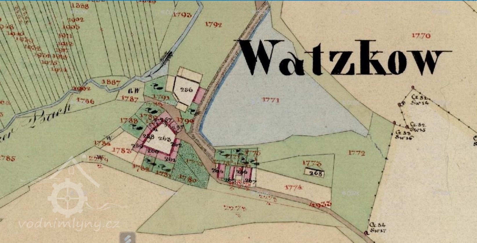 ...Melivo vozí se do šesti mlýnů ležících na dvou potocích. Z těch větší přitéká ode Lhotky a naplňuje nejprve rybník u mlýna na Vackově. Vackov je skupení jedenácti chalup kolem mlýna čtvrt hodiny cesty k východu od Černovic. Mlýn ten patříval před časy k Svatavě, ale r. 1596 k žádosti mlynáře Václava připojen jest od Petra Voka z Rozemberka k Černovicům. Blíže městu pod Vackovem protéká potok rybník u mlýna „Ťápalova“, kdež i pila se nalézá. Na SV. pod Moudrovem vzniká potok druhý, naplňuje rybníky „Hořejší“ a „Dolejší“ při mlýnech týchž jmen, ležících u samého městečka, odtud teče Předměstím a Pršínem, kdež je most kamenný se sochami sv. Jana Nepomuckého a sv. V8clava a při západní straně města běží do obory, kdež se spojuje s potokem prve dotčeným. Část vody shražená žene pod oborou mlýn „Šelichův“ a ještě dpleji naplňuje rybník hluboký s koupadlem u mlýna Louckých. V létech suchých potoky tak málo vody rybníkům dodávají, že jen po přestávkách, vždy až se rybník naplní, mlýti se může... (pep)
