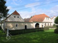 Na průčelí napojena zídka s pravoúhlým vchodem pro pěší a představeným obloukovým vjezdem s vyznačeným klenákem. Stříška nad brankou a vjezdem kryta bechyňskými háky.
