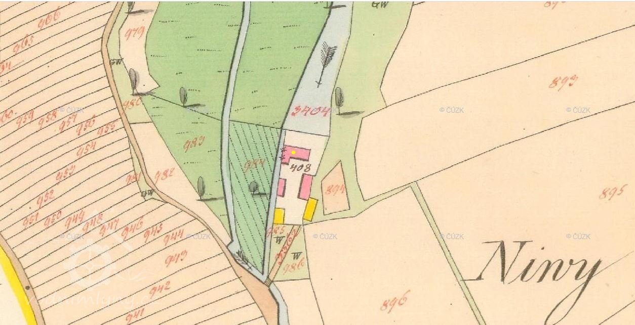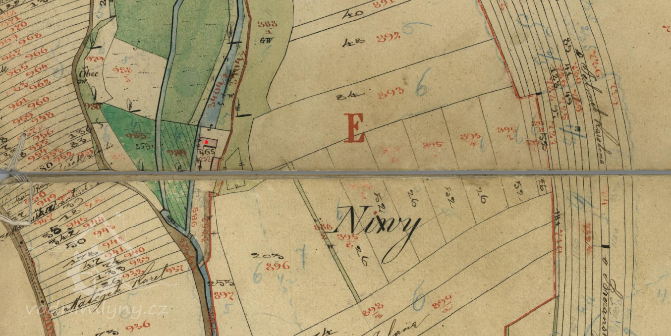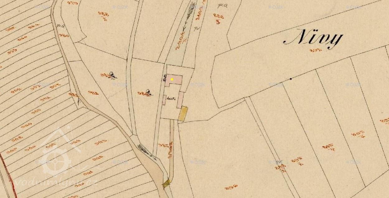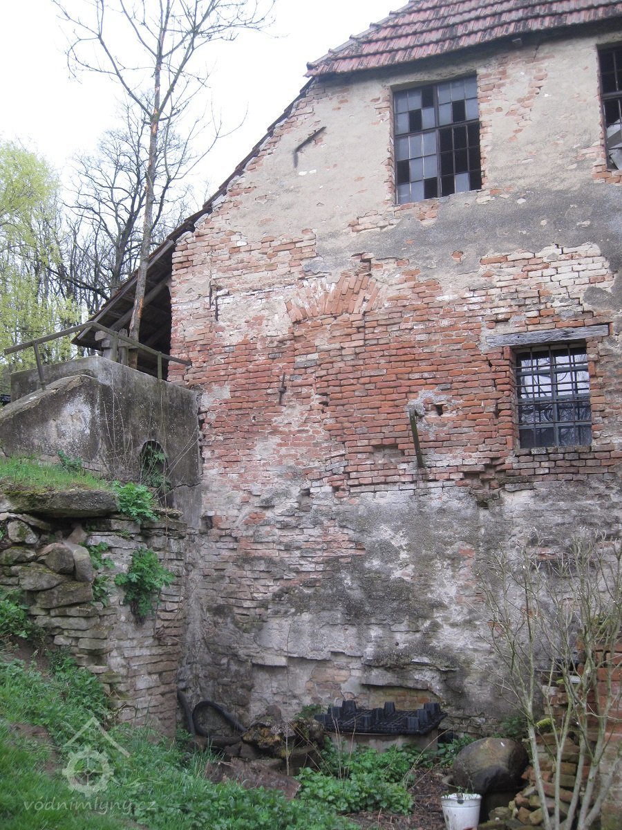Na Cís. otisku celý potok převeden do náhonu (není použit odběr části vody z potoka). Teprve voda z jalového přepadu (asi 400m S od mlýnice) teče přirozeným korytem. Dnes po tomto přepadu není stopy (on ani zmíněná strouha nejsou zachyceny ani na ortofoto r. 1953). Těsně před mlýnem akum. nádržka. V jejím JZ rohu dnes zbytek betonového jal. přepadu kombinovaného s trubkou vedoucí vodu k vodnímu motoru.