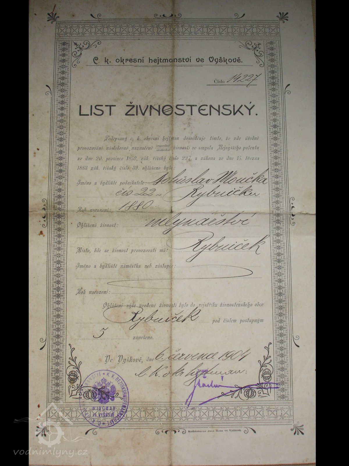 19. 12. 1756 Ferdinand Julius Troyer, biskup olomoucký, v zastoupení Františka Žalkovského ze Źalkovic, hejtmana panství vyškovského, prodává Josefu Kozovi z Uherského Hradiště mlýn u rybníka ve vsi Rybníčku, pozůstávající z jednoho mlýna, pak mlýna kašového, dále zahrady, 12 měřic vrchnostenské půdy ve třech polích s výhradou vrchního vlastnictví a právem retraktním v případech odprodeje za 420 zl. rýn.