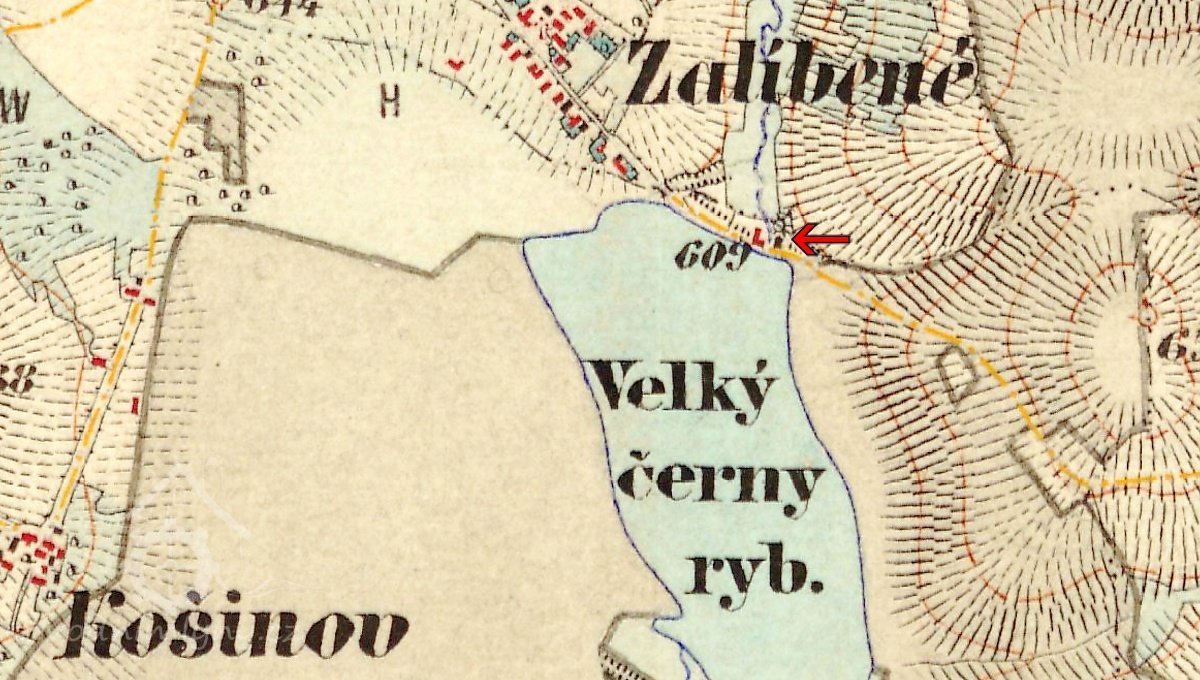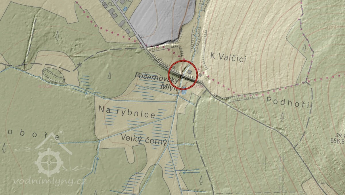 Mlýn a pila se nacházely pod hrází zrušeného rybníka Velký Černý. Obě zařízení jsou známa od 18. století. Mlecí složení doplňoval krupník o třech stoupách. Zdejší pila dodávala řezivo pro přestavbu hlinecké radice kolem roku 1792.