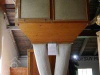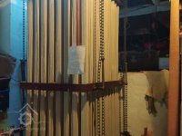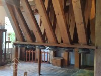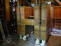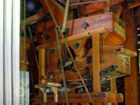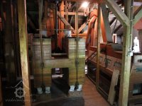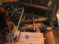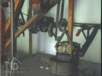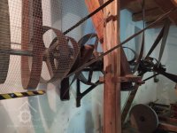3. transmise - kovové řemenice a ploché řemeny vedoucí do prvního podlaží a třetího podlaží