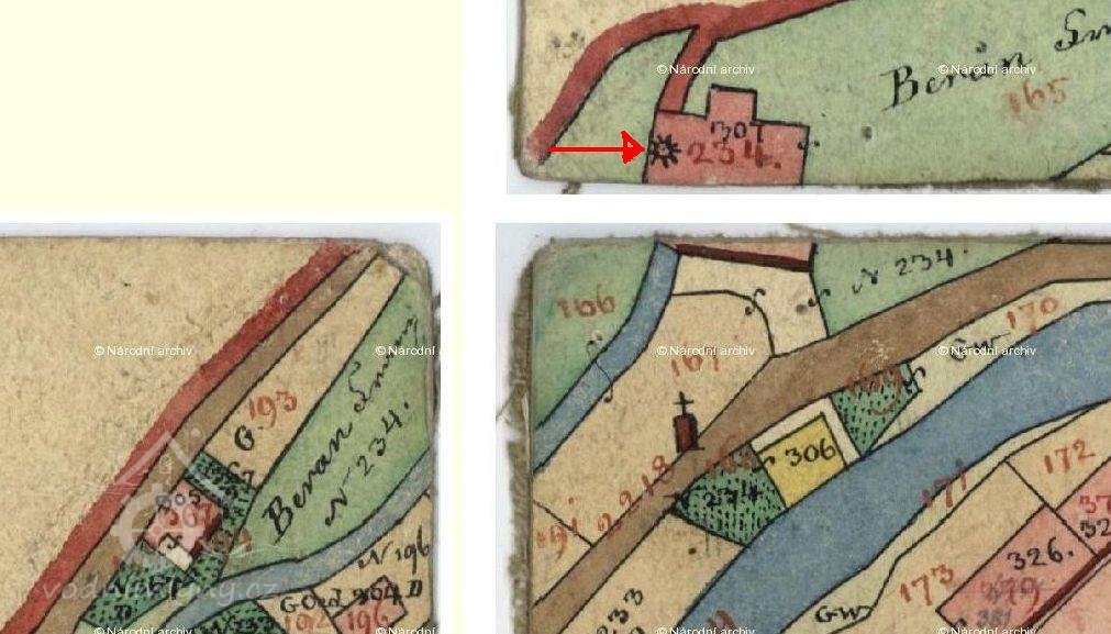 Je zobrazen na Indikační skice z r. 1842 jako mlýn (majitel František Beran) a na Císařském povinném otisku z r. 1842 jako objekt z nespalitelného materiálu čp. 234 na náhonu z Rokytky bez mapové značky mlýna.