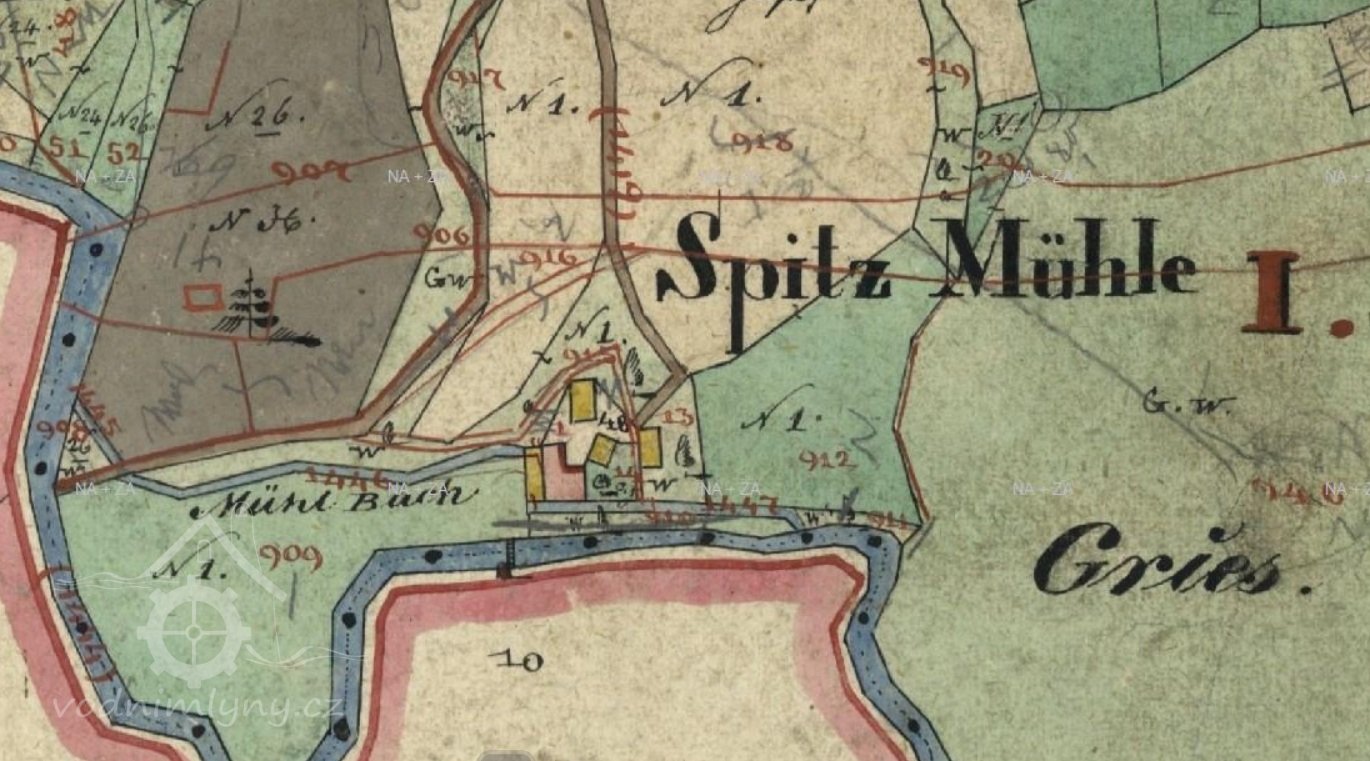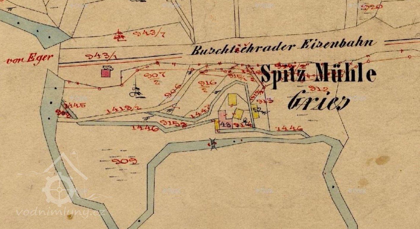 Popis1930: 1 kolo na svrchní vodu, hltnost 0,194 m3/s, spád 3,3 m, výkon 5,5 HP