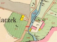 V roce 1677 je zmiňován mlýn s pilou Jakuba Hačeckého „kterejž bejval o dvou kolách nebo strojích mlejnských a stoupy se kolem mlejnským táhly. Vody tok svobodný i na pilu z rybníka panského Dlouhého Hačeckého“.