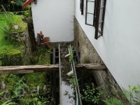 Voda přicházela na mlýnské kolo z rybníka nad mlýnem rourou v hrázi a žlabem.