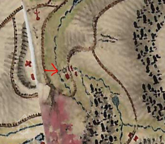 Na indikační skice a císařském otisku v r. 1839 je vidět, že stál na levém břehu strouhy vedoucí ke Starému potoku, pod sběracím rybníkem, do kterého strouha ústila. U jezu není žádné stavidlo. Přepad jezu na potoce byl 4,14 m dlouhý a 3,24 široký a byl mezi dvěma pevnými břehy z hrubého dřeva. Před sběracím rybníkem vede přívodní trubka, sběrací rybník je bahnitý se dvěma stavidly, vstupní stavidlo u potrubí z bahnitého rybníka 34 cm široké a 38 cm vysoké. Vantroky ke mlýnu měly délku 6,5 metru, 1,11 m šířku a 1,19 m výšku. Na konci vantrok jsou průtokové otvory, přes které je voda přiváděna na úříslušná vodní kola na vrchní vodu.