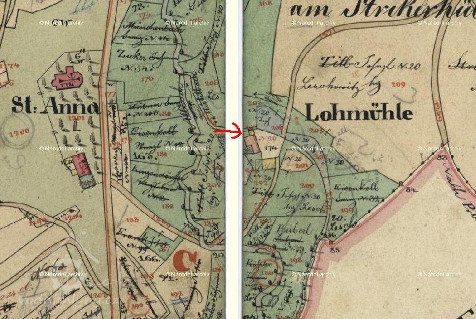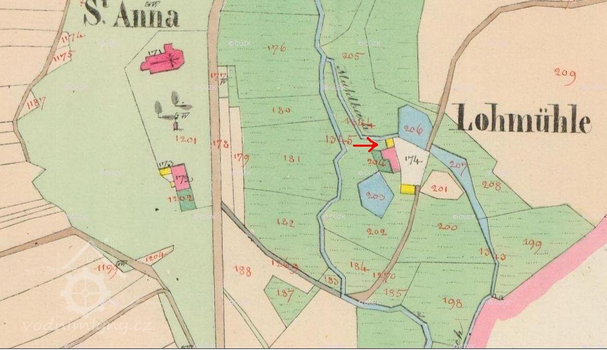 Mlýn je zobrazen již na I. vojenském mapování v letech 1764-68, a to na soutoku Starého a Plachtínského potoka, východně od kaple sv. Anny.