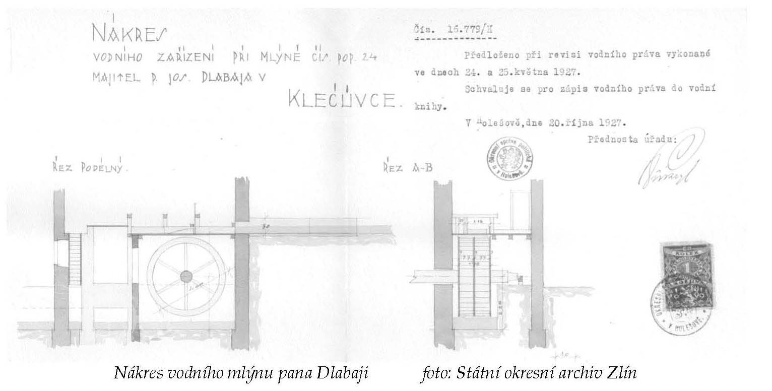 Podepsaní mlynářští znalci Josef Petr, mlynář v Hulíně a Richard Peci, mlynář v Chomýži, prohlédli vodní dílo při shořelém mlýně pana Dlabaje — nyní firmy Baťa a. s., při čemž zjistili, že vodní dílo jest úplně zrušeno, voda neteče na bývalé vodní zařízení. Podle úředního sdělení o množství průtoku vody a vodním spádu odhadli jmenovaní normální průměrnou sílu vodního díla na 6—8 HP. Tuto sílu odhadují okrouhle na 100.000.—Kč, také z toho důvodu, že mlýn jest úplně zrušený a voda teče mimo mlýn.