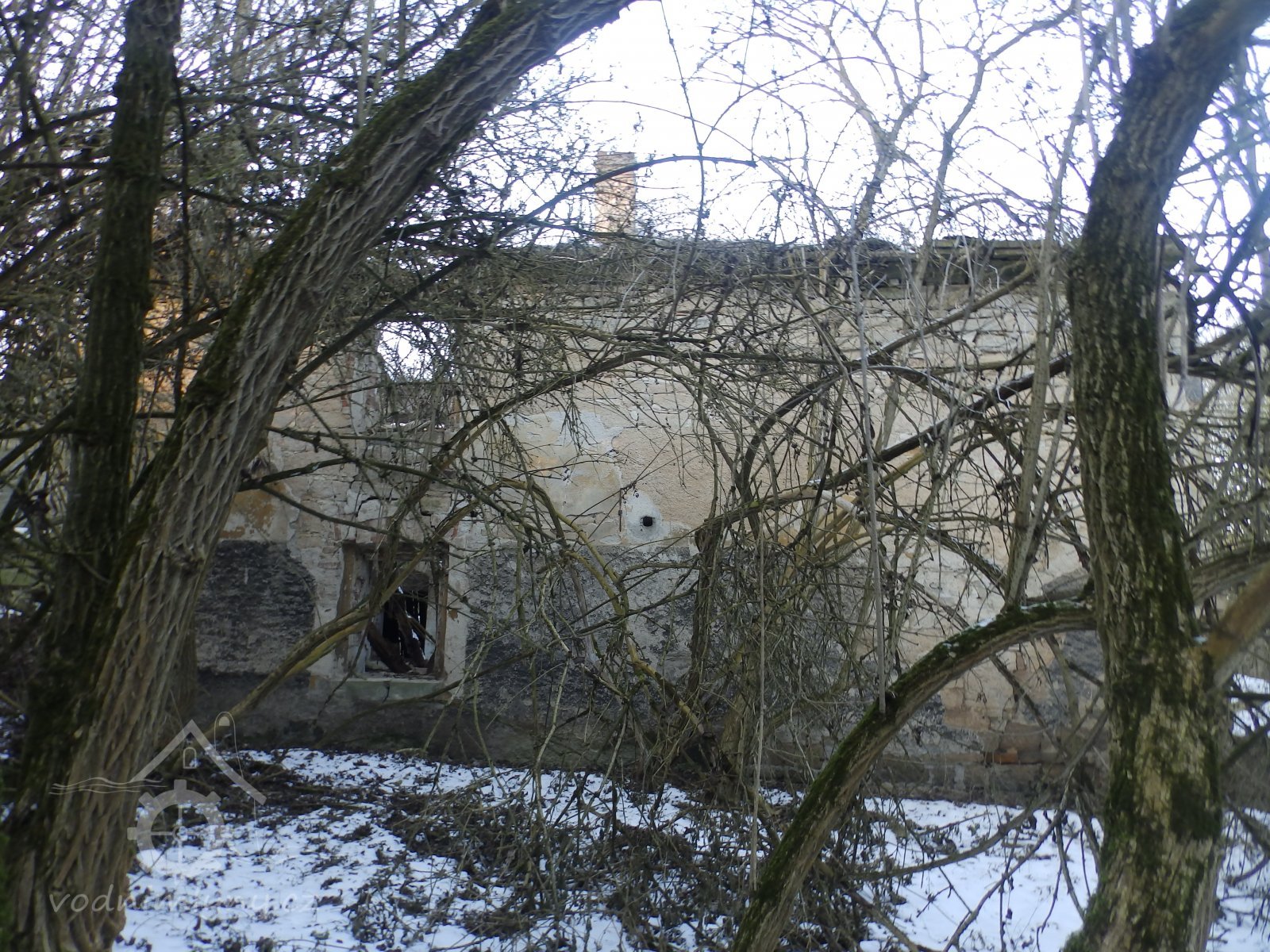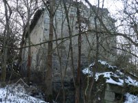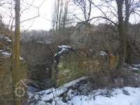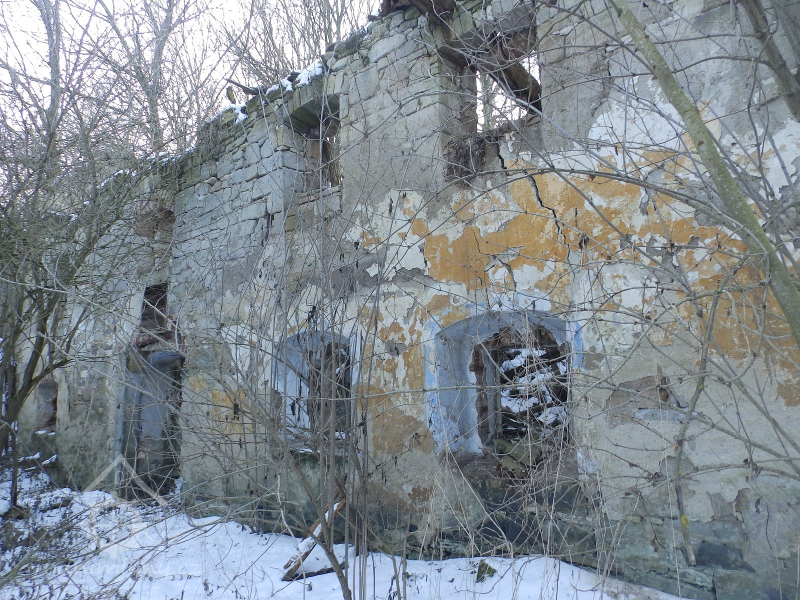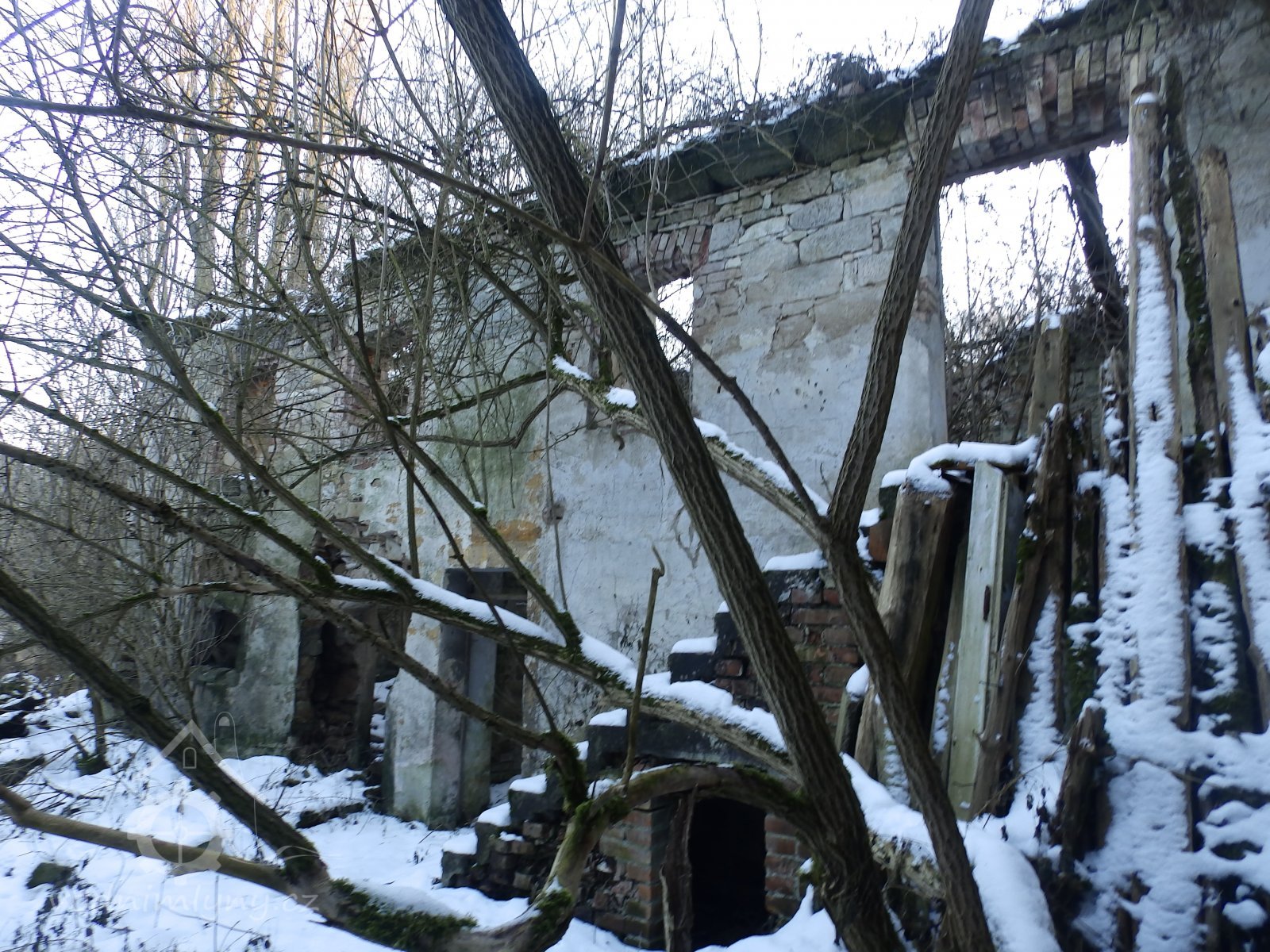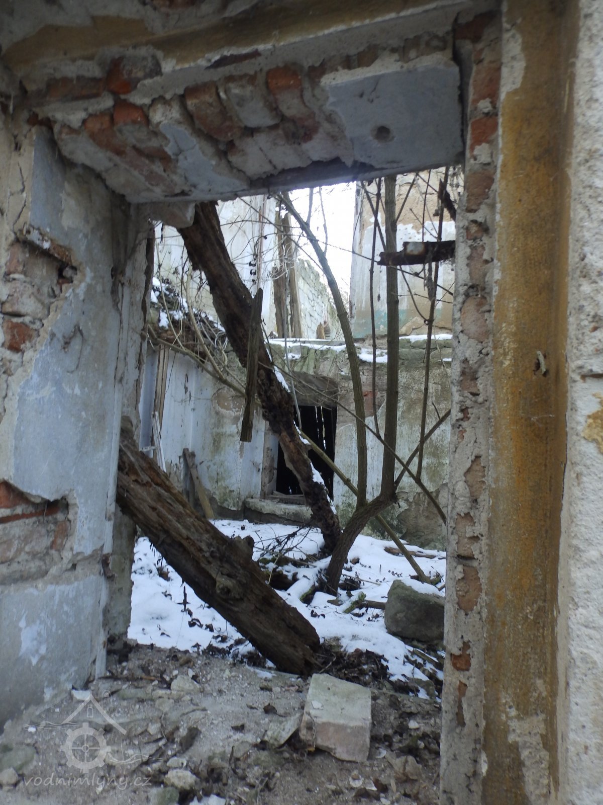 Mlýnice a obytná budova uspořádány do L, na jejich styku v rohu umístěna lednice.