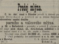 1882 vdova Marie Breychová; parní a válcový mlýn jde do dobrovolné soudní dražby, vyvolávací cena 34.000 zl., vadium 4.000 zl.