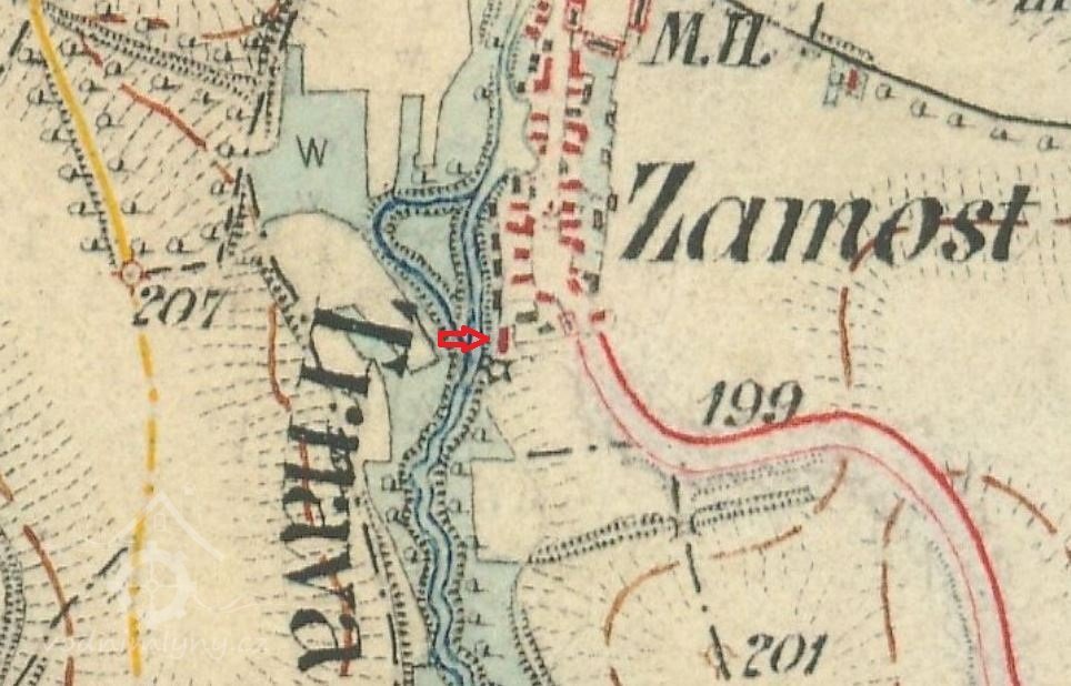 V obci Zámostí byl nad mlýnem rybník, ze kterého vedl náhon na mlýn. Náhon začínal v pravém rohu rybníka přibližně na úrovni současného čp. 5 a tekl rovně k mlýnu. Odpad od mlýna tekl zpět přímo do řeky Mrliny.