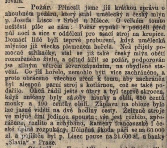Mlýn vyhořel v r. 1877 za mlynáře Josefa Lisce. (RR)