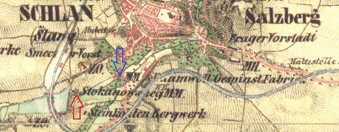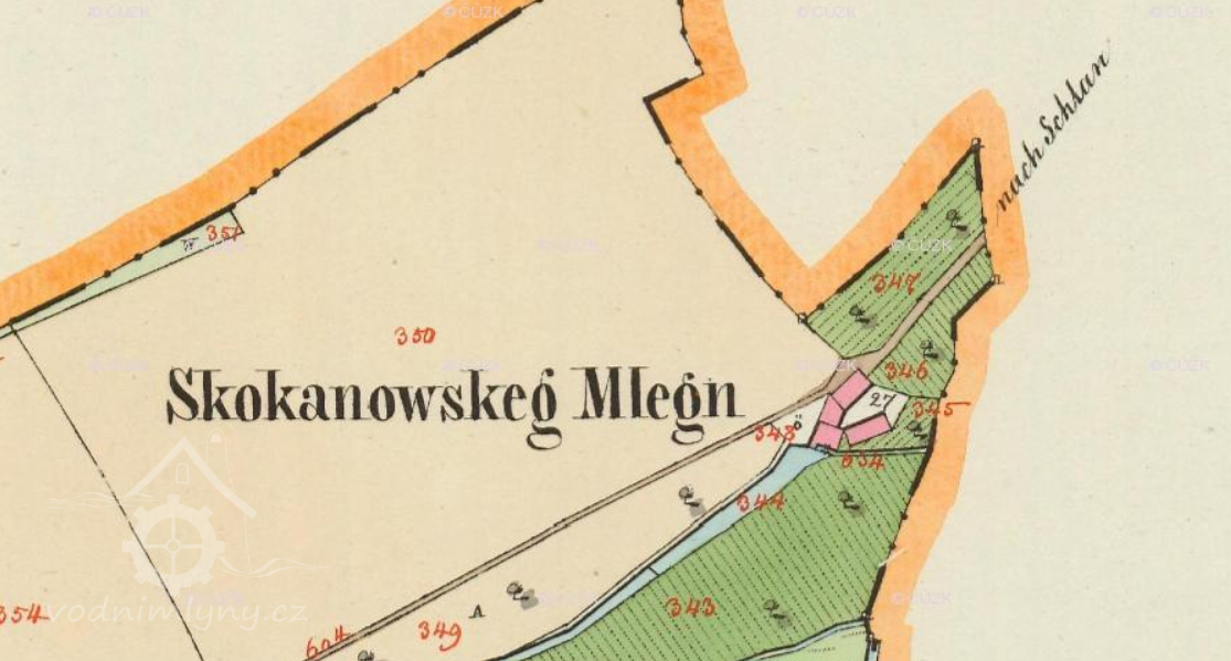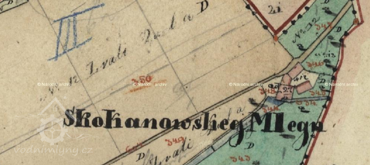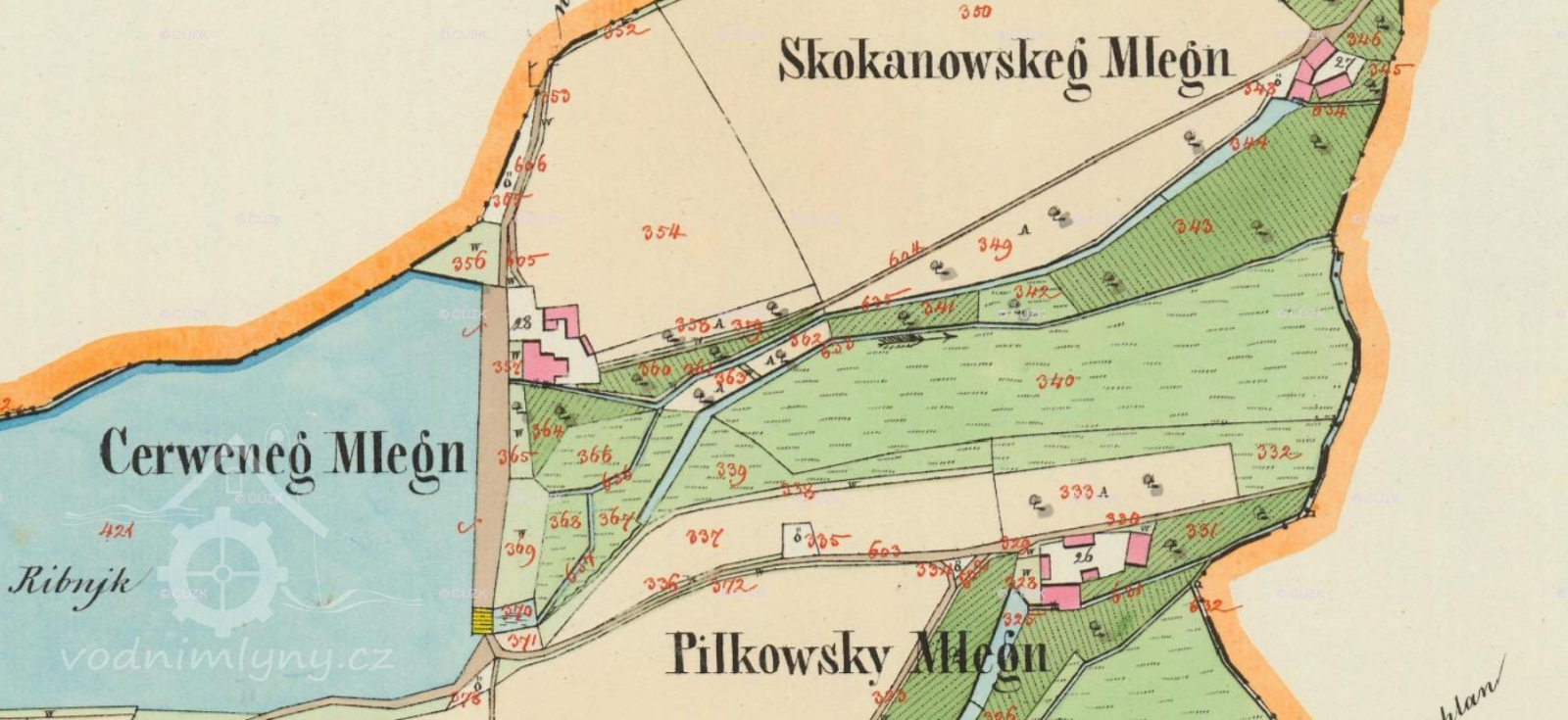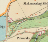 Severovýchodní z dnes již zaniklé trojice mlýnů (Červený, Skokanovský a Pilkovský) na východním okraji Kvíčku na hranicích s katastrem města Slaného.