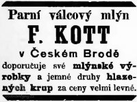 srpen 1883 zakoupil František Kott (nar. 1845), který již měl praxi jakou vedoucí parního mlýna pí. Termové v Brandýse nad Labem a se svou manželkou založil pekařství a krupařství ve Kbelu.
