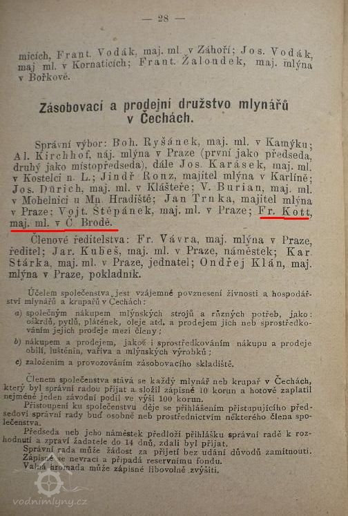 1899 - Fr. Kott členem výboru Spolku mlynářů českomoravských v Praze, členem správního výboru družstva mlynářů v Čechách (Pr, Duška - Kapesní kalendář mlýnů českomoravských - 1899) (HŠ)