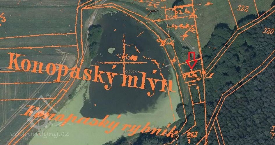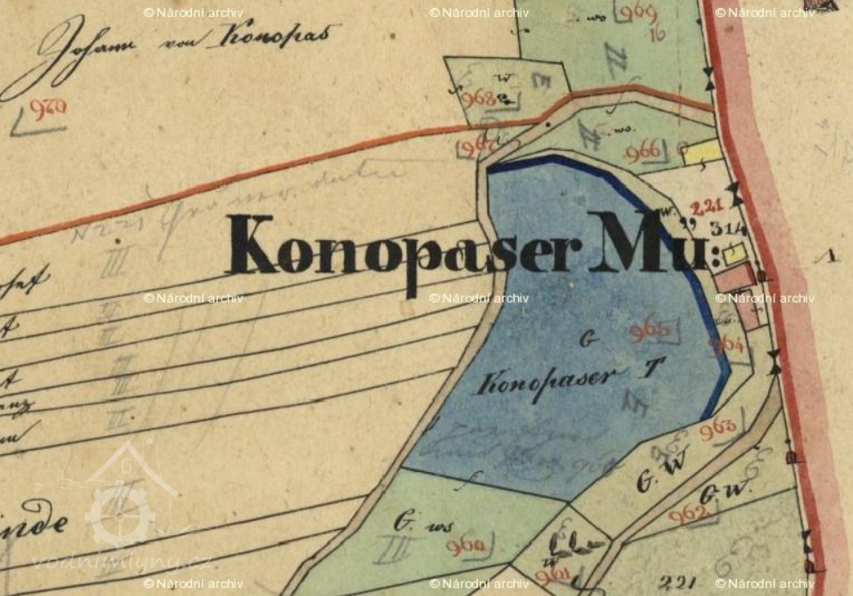 Mlýn pod (dnes protrženým) Konopaským rybníkem na východním okraji novostrašeckého katastru, doložený již k roku 1610. Od poloviny 17. stol. majetkem obce a pronajímán, 1923 přestavěn na elektrických pohon, v 50. letech ukončen provoz, v letech 70. zbořen, trosky rozvezeny a mlýniště rekultivováno.