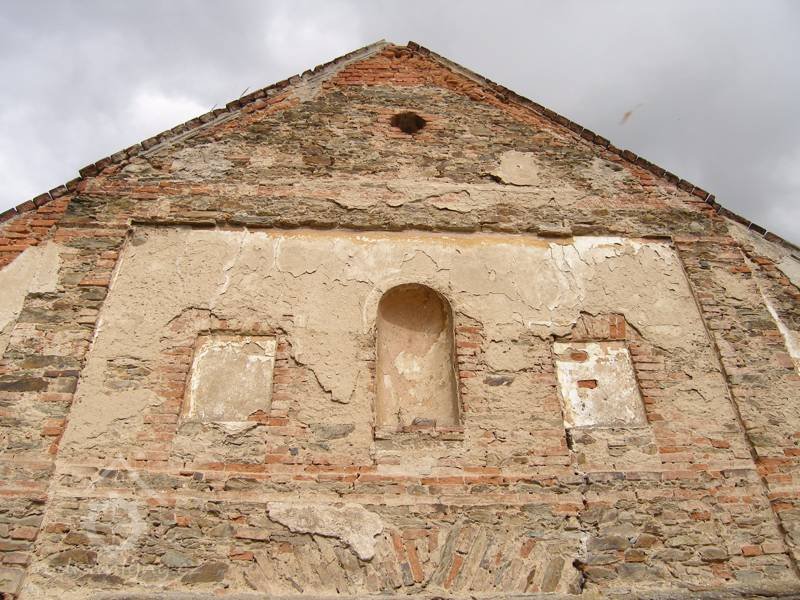 Štít mlýnice před rekonstrukcí, 10 2008, © Šárka Koukalová, (Prvky na obrázku: plastická omítková výzdoba fasád a štítů, zdobený zděný štít)