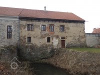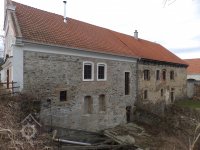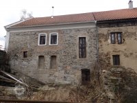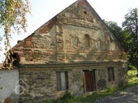 Průčelí mlýnice před rekonstrukcí, 10 2008, © Šárka Koukalová, (Prvky na obrázku: plastická omítková výzdoba fasád a štítů, zdobený zděný štít)