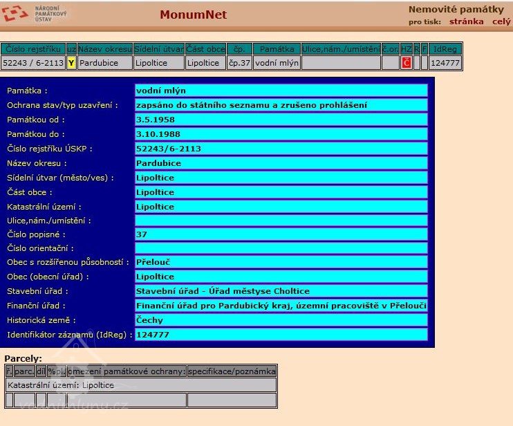 Dle údajů Národního památkového ústavu byla budova mlýna v období 3.5.1958 až 3.10.1988 chráněna jako nemovitá kulturní památka, vodní mlýn čp. 37 pod číslem ÚSKP 52243/6-2113. Roku 1988 byla památková ochrana zrušena. Následně byla budova zbourána.
