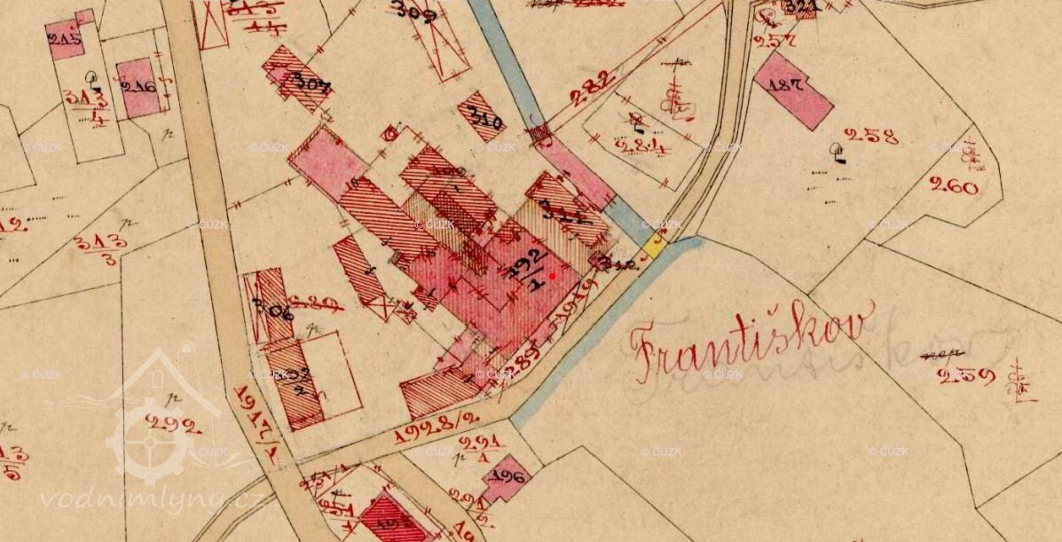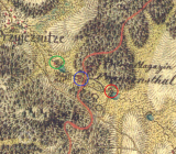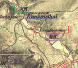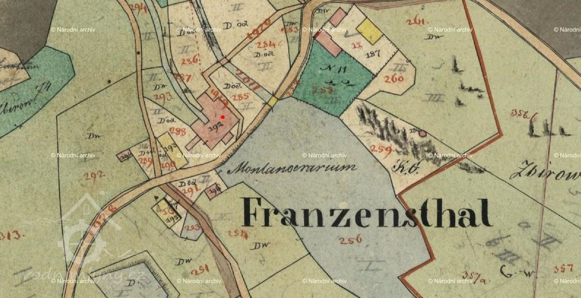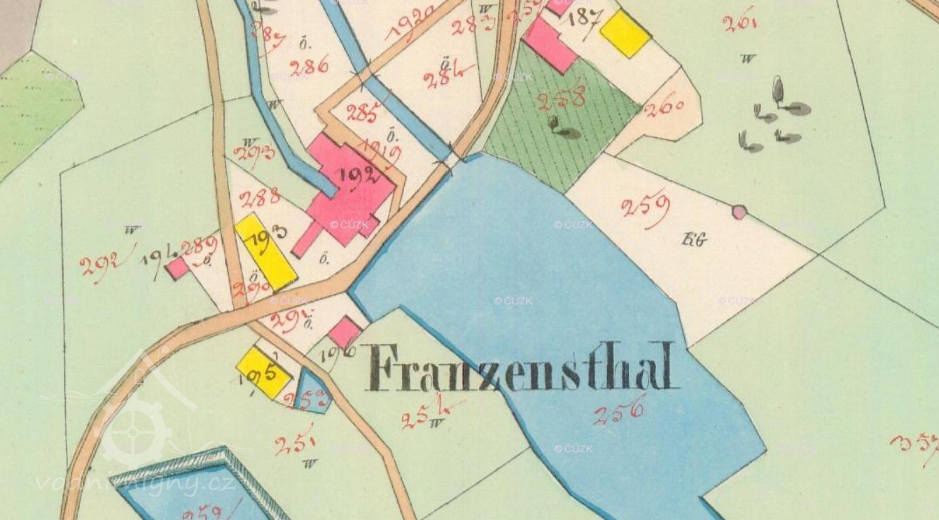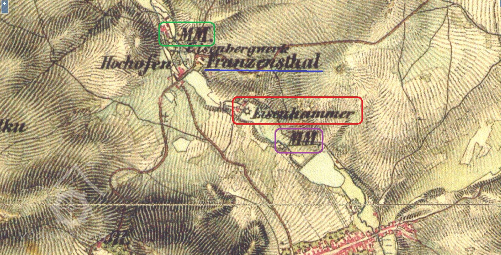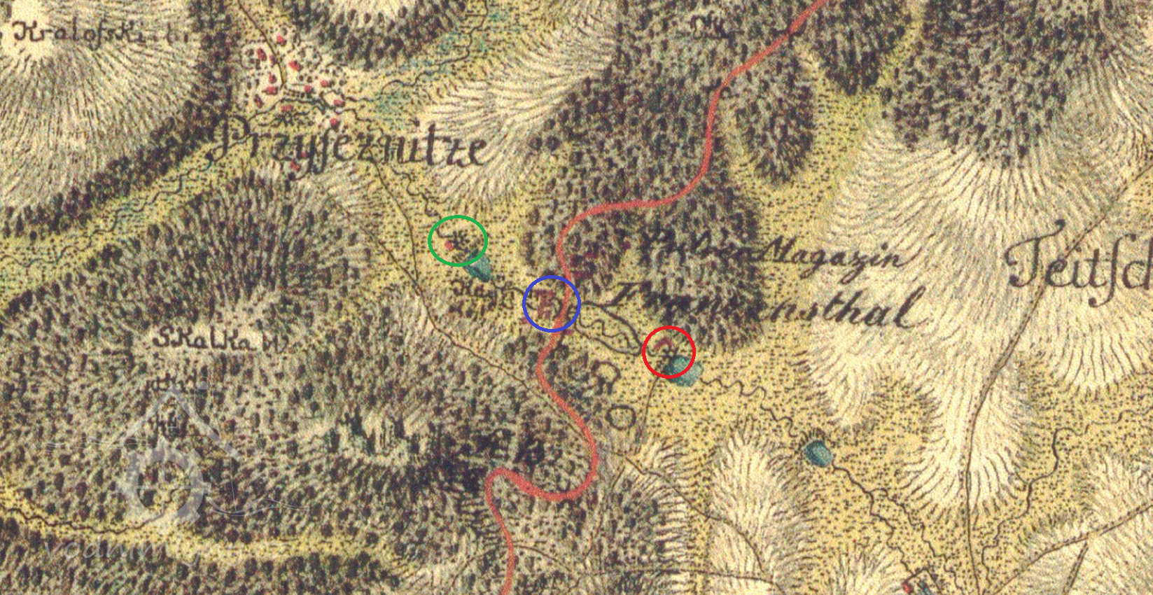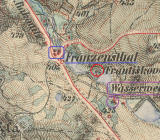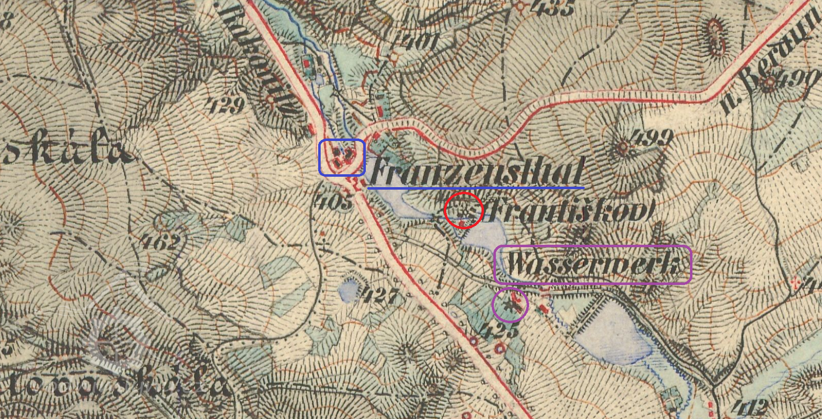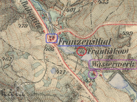 Na mapě I. vojenského mapováni je zakreslen Franzensthal - Pulwer Magazin a Kaÿ. (?, snad Kaiserhütte)