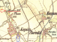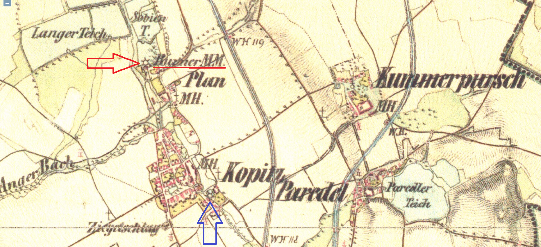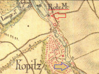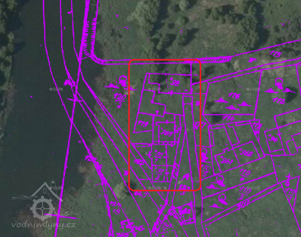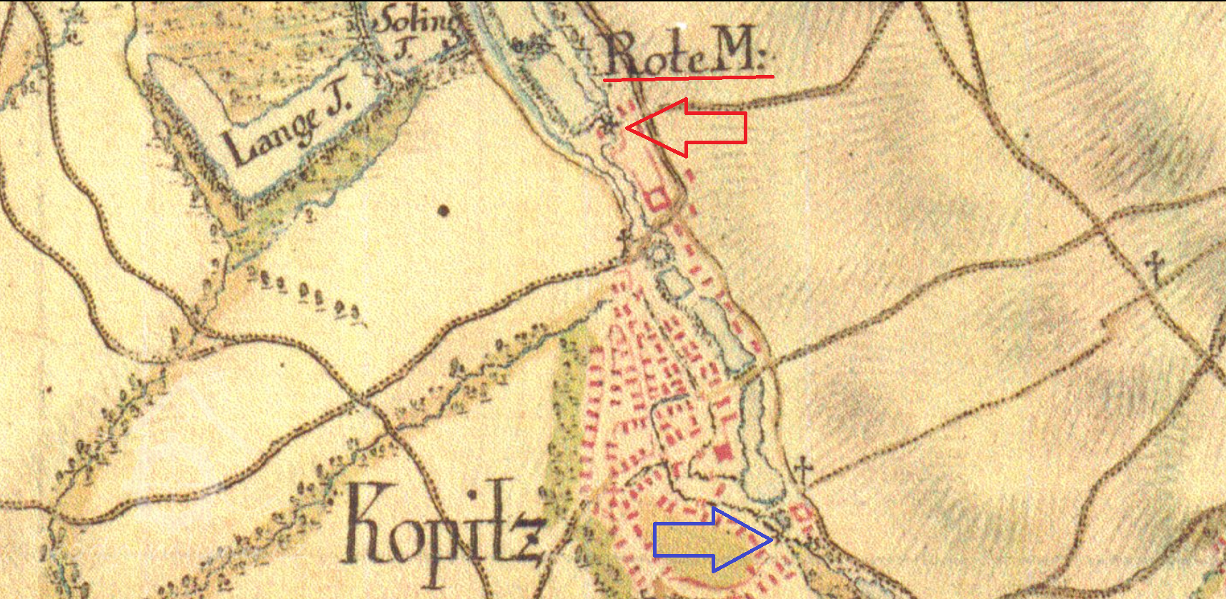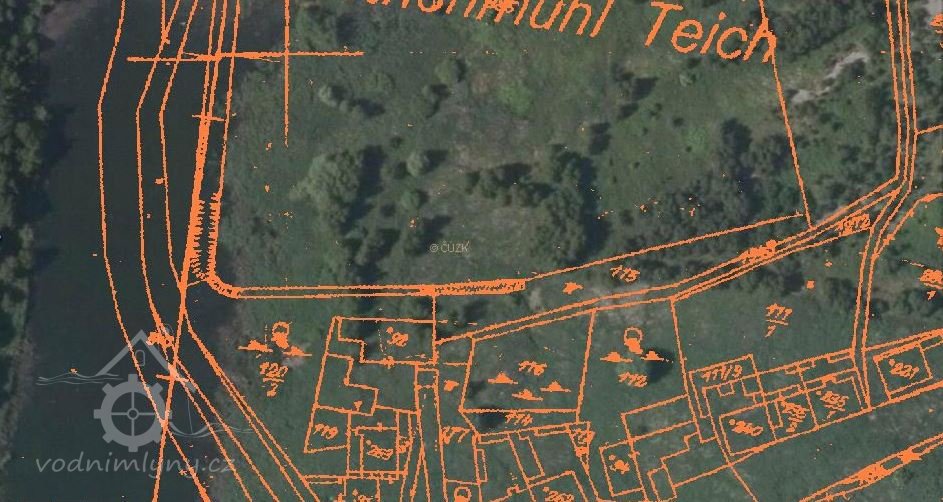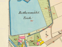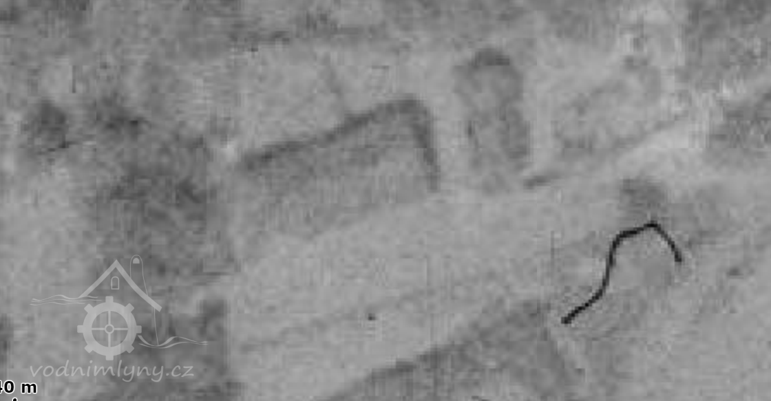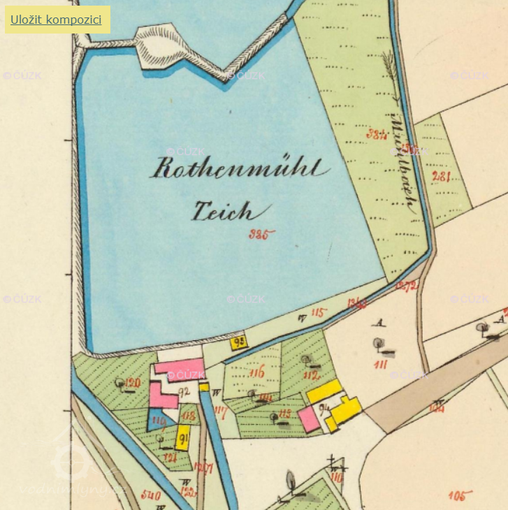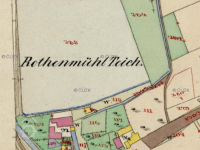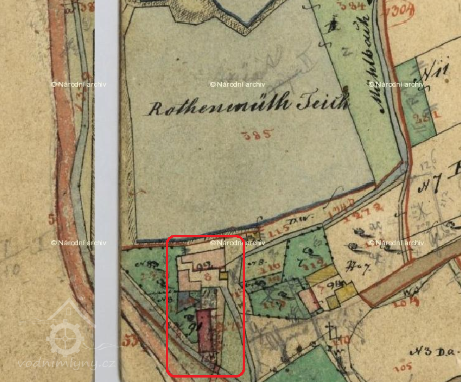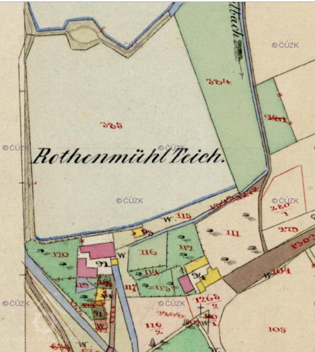 Nad mlýnem býval rozlehlý Červenomlýnský rybník (Rothenmühl Teich)