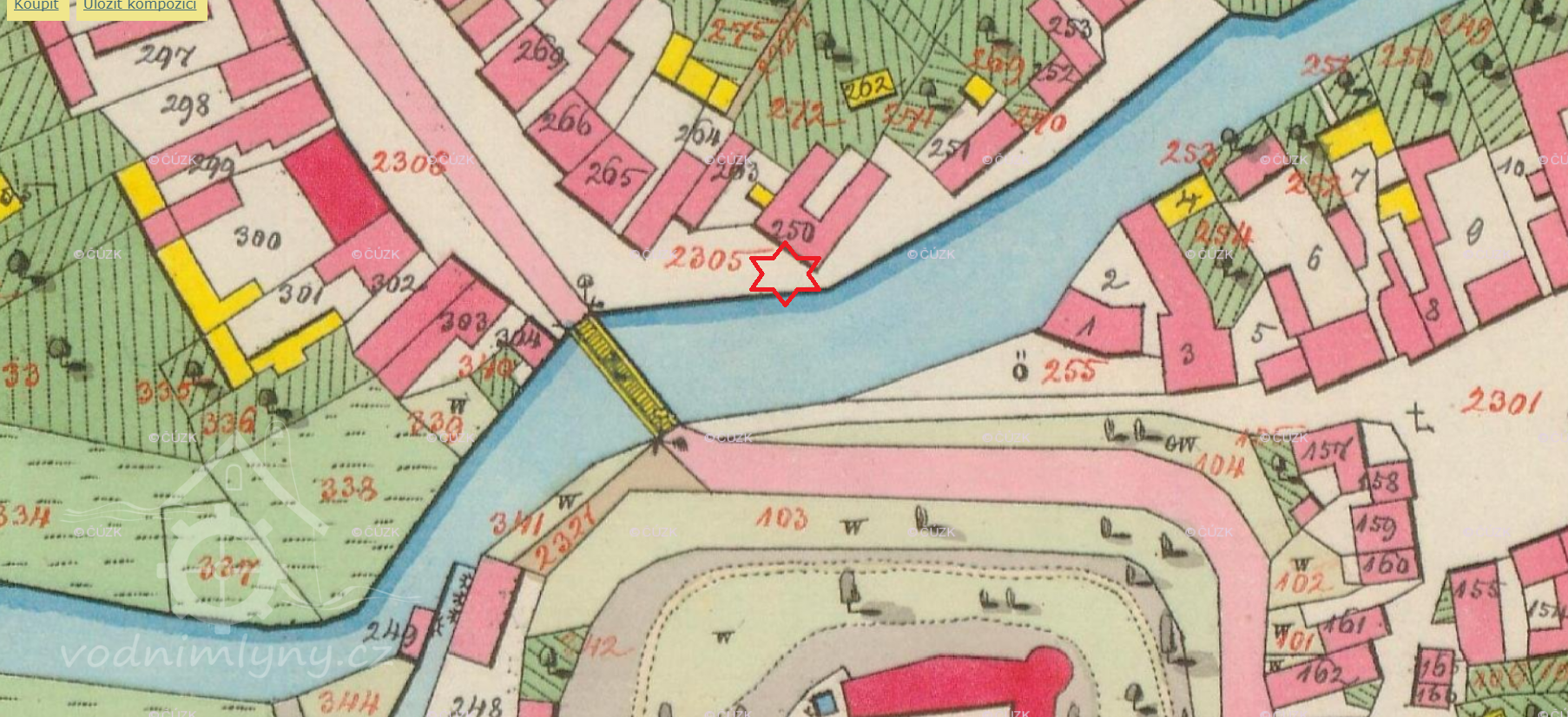 Voda přiváděna náhonem buď z řeky Blanice nebo z rybníčku pod skalou nad řekou. Náhon procházel přes sousední dům čp. 59.