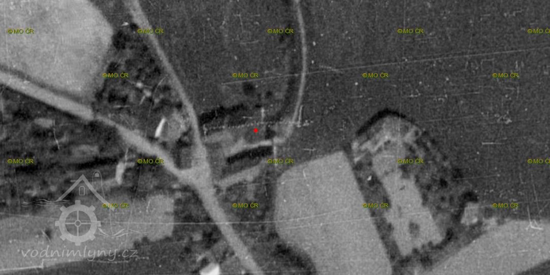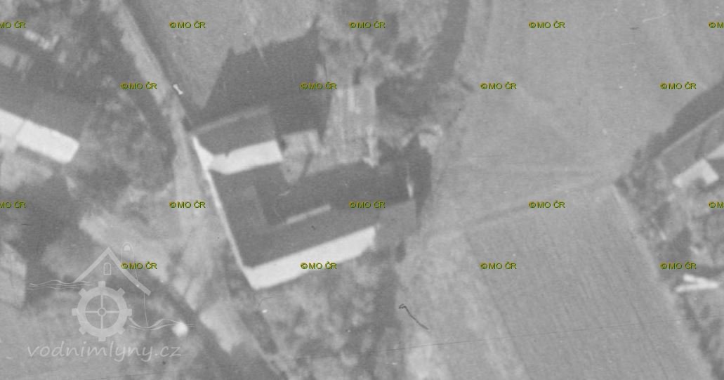 Na leteckém snímku z 50. let 20. století je již mlýn v troskách.
