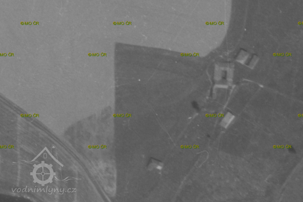 Mlýn s pilou pod Hrdoňovem na potoce před soutokem s Vltavou, po roce 1952 zatopen vodou Lipenské přehrady.